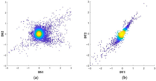 In order to obtain the final change intensity of spectral and texture features, a scatter plot is used to show the relationships between features. Figure 2 presents a scatter plot of the first two bands of DS and DT. In the scatter plot, a color gradient is used to represent the density of the scatter points, with red to purple representing the decrease in point density.