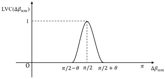 Due to the resolution of remote sensing images and the influence of terrain, it is difficult to achieve the condition where two adjacent sides of a building are completely vertical. Therefore, an allowable error of the inclination angle difference is introduced. In this study, the value of was set to 4 degrees. In order to assign different weights to the vertical line segments under different errors, functions based on the difference in inclination angle are introduced to represent the verticality of the line segments. The expressions are as follows:
