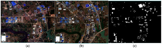 Experimental remote sensing images. (a) A true color image from May 2012. (b) A true color image from August 2016. (c) Newly built buildings reference map.