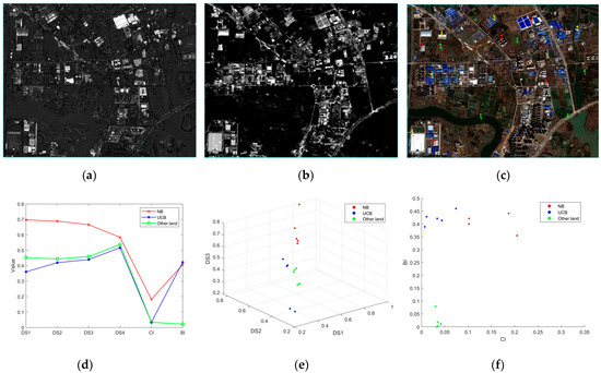Performance of BI and CI on the main land-cover classes: (a) change intensity (CI); (b) post-temporal building intensity (BI); (c) sampling point location (red for NB, yellow for UCB, green for other land); (d) line chart of main land-cover classes for different features; (e) scatter plot of main land-cover classes for spectral features; (f) scatter plot of main land-cover classes for BI and CI.