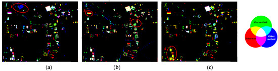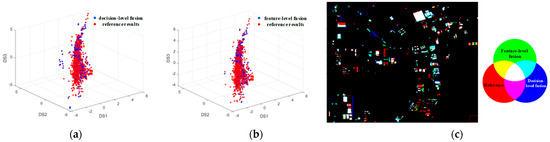 Figure 8 provides a visual comparison of the results obtained using decision-level fusion versus feature-level fusion. Specifically, Figure 8a,b depict scatter plots within the spectral difference space, comparing the newly built building results from each fusion method against the reference data. While both sets of results exhibit some similarity, the point cloud representing the decision-level fusion result demonstrates a more pronounced deviation from the reference point set. Figure 8c overlays the newly built building detection results from both fusion methods with the reference map. Analysis of this figure reveals that the decision-level fusion results contain a higher prevalence of false alarms (depicted by blue areas in Figure 8c). Furthermore, the presence of yellow patches indicates that the decision-level fusion approach exhibits greater omission errors compared to the feature-level method. Notably, the scarcity of pink patches suggests that the feature-level fusion method achieves superior detection completeness with fewer omissions.