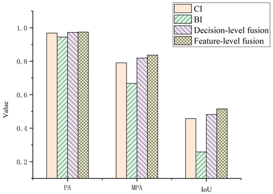 Comparison of different fusion methods, showing a quantitative evaluation of the accuracy achieved using the individual features (BI and CI, representing post-temporal building intensity and change intensity, respectively) and the two fusion methods. The quantitative results (PA: 0.968, 0.944, 0.972, 0.974; MPA: 0.791, 0.668, 0.819, 0.836; IoU: 0.457, 0.258, 0.482, 0.515 for CI, BI, decision-level, and feature-level fusion, respectively) demonstrate that the feature-level fusion strategy outperforms both single-feature approaches and decision-level fusion, achieving the best overall accuracy.