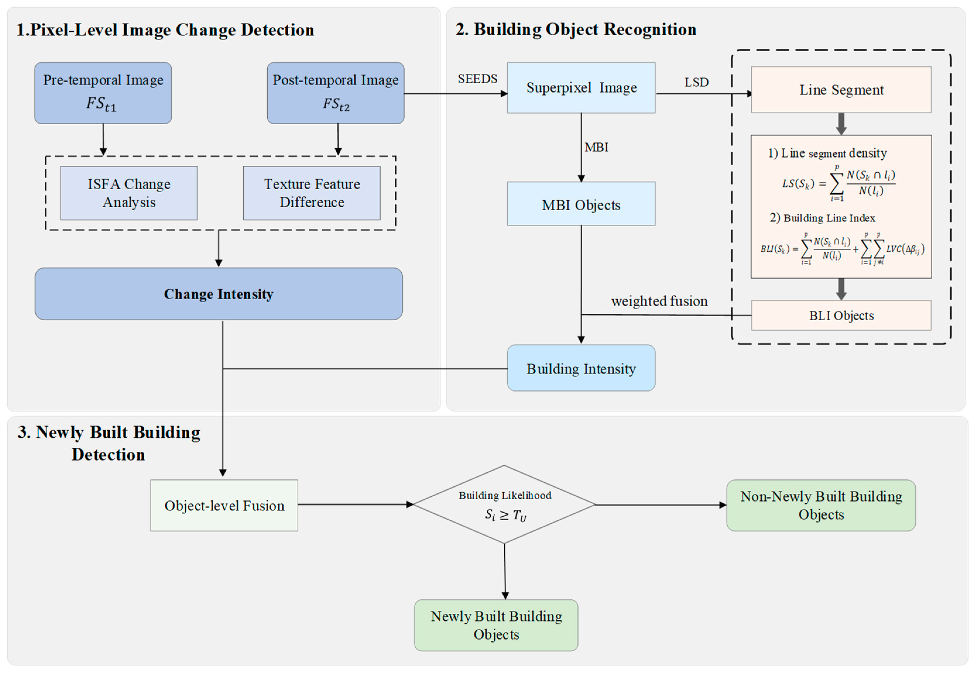 38], this method utilizes spectral and texture features to derive multi-temporal change information, subsequently applying MBI change information to filter out building change objects.