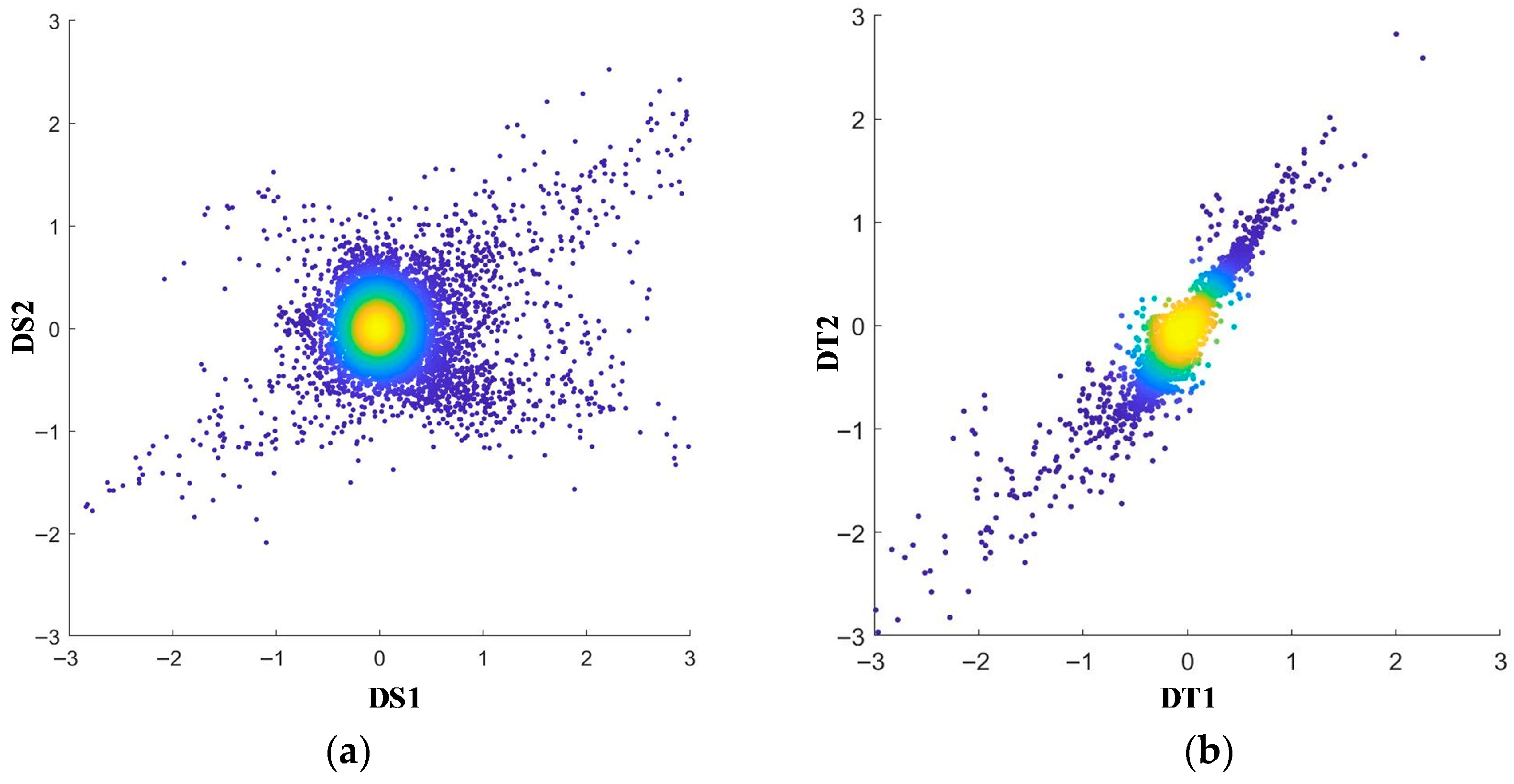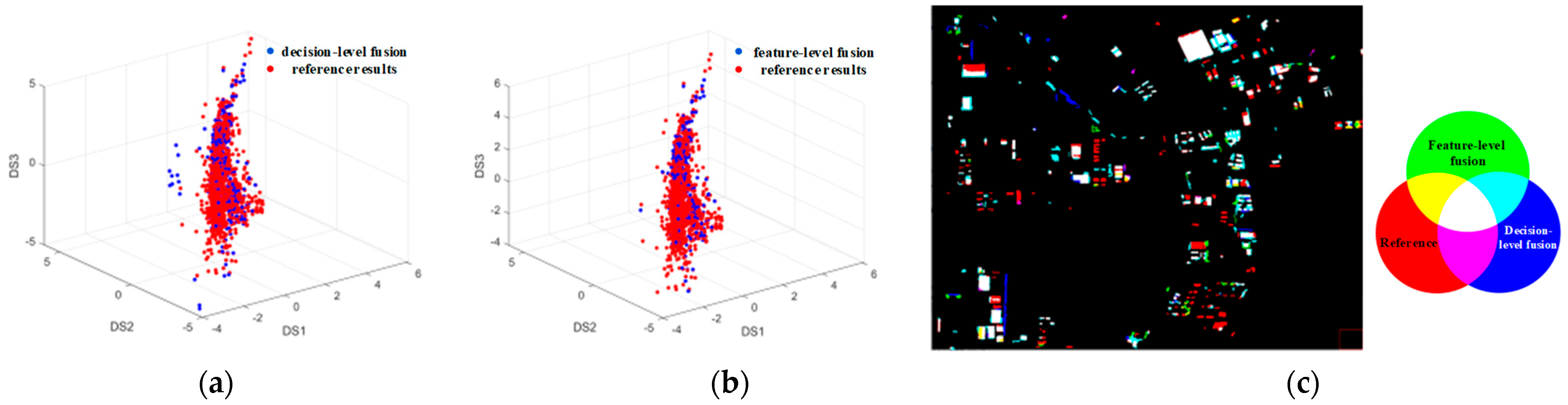 Figure 8a,b depict scatter plots within the spectral difference space, comparing the newly built building results from each fusion method against the reference data. While both sets of results exhibit some similarity, the point cloud representing the decision-level fusion result demonstrates a more pronounced deviation from the reference point set.