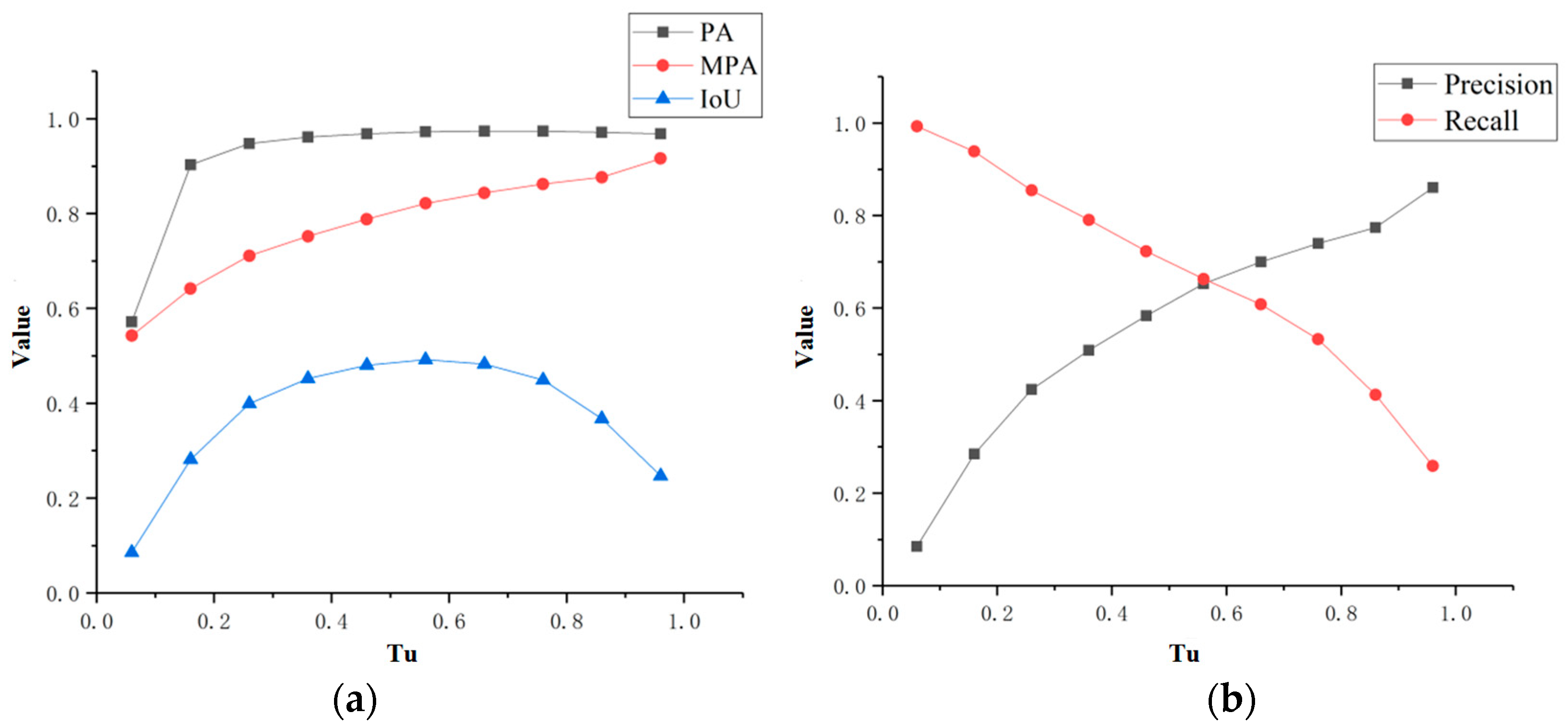 on the accuracy IoU of newly built buildings in more detail. The IoU provides comprehensive accuracy statistics of the recall and precision of newly built buildings. When the difference between recall and precision gradually becomes equal, IoU reaches the maximum; when the difference increases, the IoU begins to decrease.