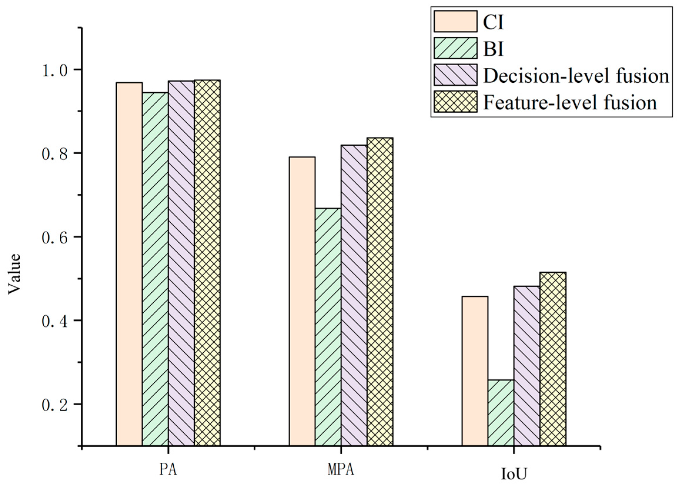 Figure 9 quantitatively compares the accuracy achieved using the individual features (BI and CI, representing post-temporal building intensity and change intensity, respectively) and the two fusion methods. The single-feature comparison clearly indicates that CI yields significantly higher accuracy than BI. This discrepancy primarily arises because BI solely captures building presence in the post-temporal image and lacks explicit change information. Furthermore, the decision-level fusion method exhibits slightly lower accuracy than the feature-level fusion approach adopted in this study. This performance difference is largely attributable to the requirement in decision-level fusion to independently threshold each feature before performing the logical intersection operation. This multi-step process inherently introduces potential errors, leading to an increase in false alarms and consequently reducing overall extraction accuracy.