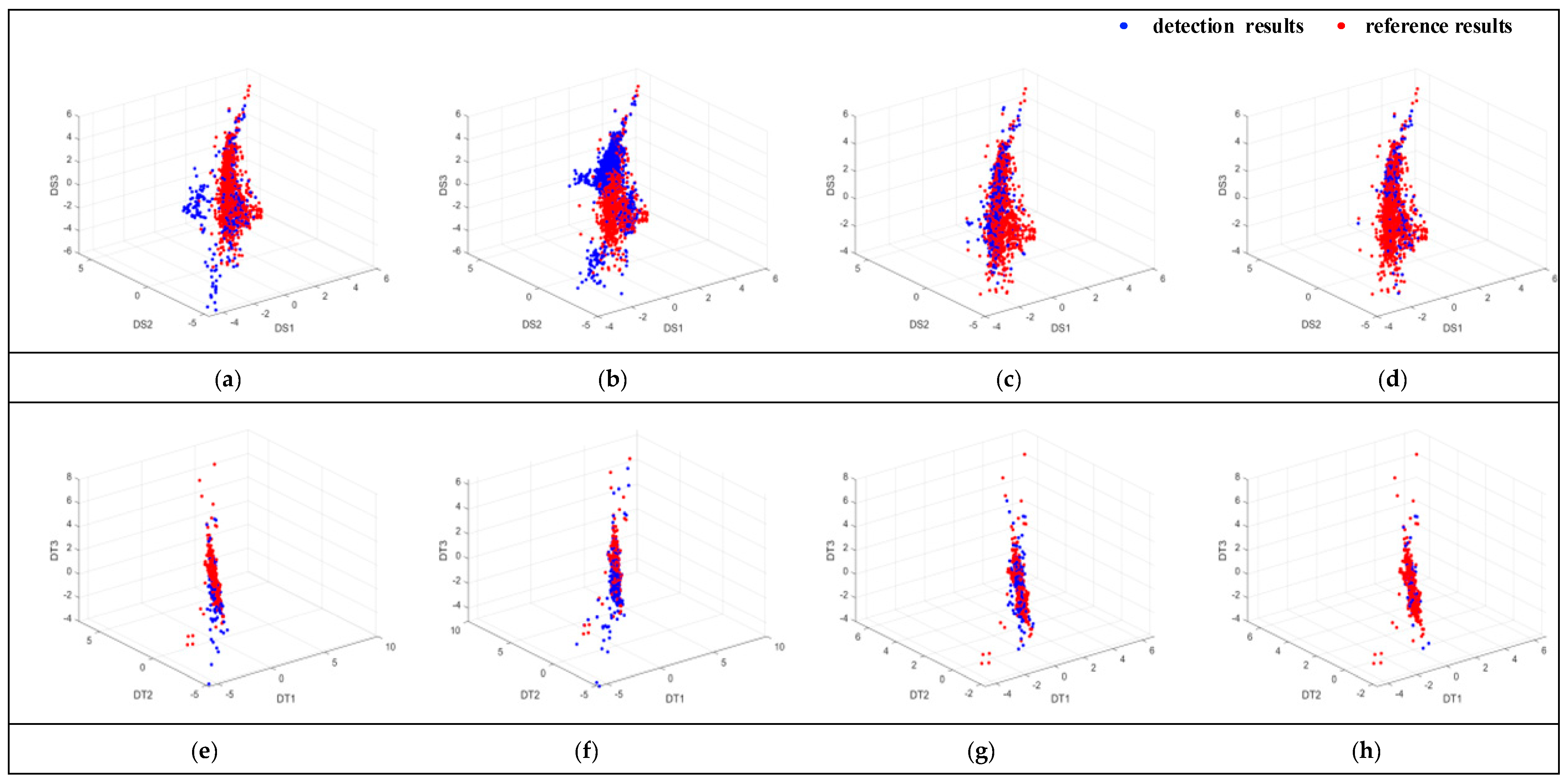 The degree of spatial overlap between the blue (method result) and red (reference) point sets within these feature spaces serves as an indicator of extraction accuracy; greater overlap signifies closer alignment between the method’s output and the ground truth. Visual inspection of