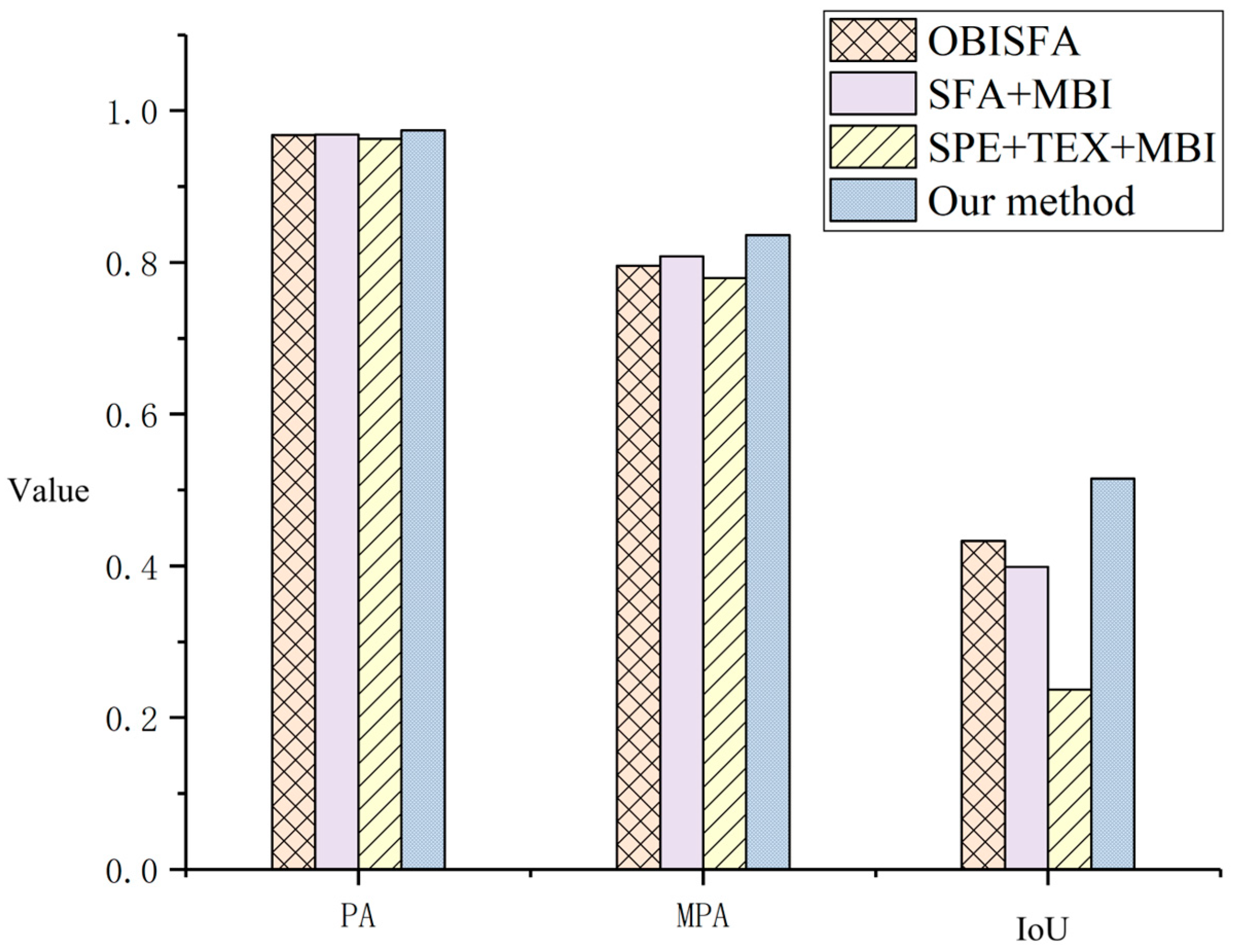 Figure 12 presents the newly built building extraction accuracy results across all comparative experiments. The results demonstrate that the method proposed in this study achieved the highest accuracy performance. OBISFA exhibited superior accuracy compared to the other two benchmark methods, attributed to its utilization of iterative weighting within ISFA, which enhances its effectiveness over the basic SFA approach. Conversely, the SPETEXMBI method yielded the lowest accuracy. This is primarily due to its reliance on threshold selection and logical operations for multiple features, introducing significant uncertainty into the extracted results and elevating the proportion of false alarms. Furthermore, SPETEXMBI’s reliance on direct differencing for spectral and texture change detection contributes to the presence of noise in the results, thereby reducing precision.