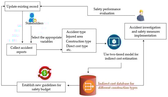 Unlike previous methods based on historical ratios between direct and indirect costs, this approach provides immediate and practical insights that enables better budget management and resource allocation for indirect costs during an ongoing project as well as guide the development of new safety budget policies and provide insight into future construction projects, as illustrated in Figure 6. As managers, stakeholders, and owners prioritize cost figures, implementing the proposed accident cost model can keep them informed of the financial impact of accidents and encourage investment in workplace safety.