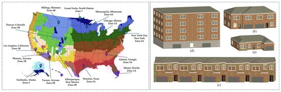 Selected U.S. locations representing ASHRAE climate zones 1–8 (left); and BIM models of four representative residential building typologies developed in Revit (right): (a) Detached, (b) Semi-detached, (c) Attached, and (d) Mid-rise apartment.
