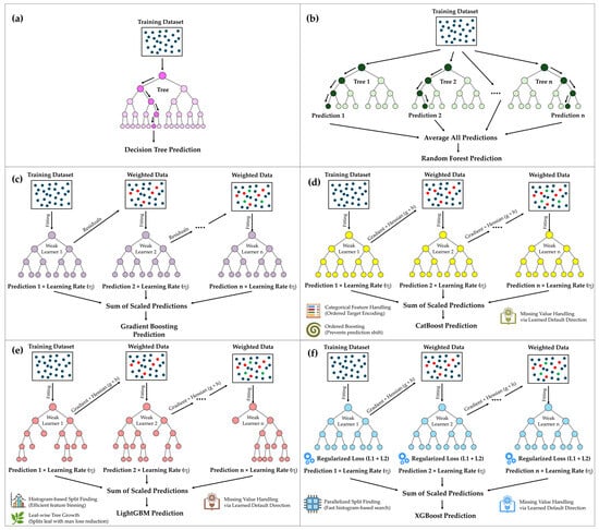Figure 3 shows a comparison of the ML models used in this study. (a) The Decision Tree is a simple predictive model that uses a hierarchical structure to split input data based on feature importance []. Although intuitive and computationally efficient, Decision Tree models are typically vulnerable to overfitting due to their inherent simplicity. To mitigate this limitation, (b) RF employs an ensemble approach by training multiple decision trees in parallel, each constructed on random subsets of the training data (bootstrapped samples) []. By averaging predictions across these diverse trees, RF significantly reduces variance, enhances generalization, and prevents overfitting. Advancing further, (c) GBM sequentially builds trees, each dedicated to correcting residual errors generated by preceding trees. Unlike RF’s parallel structure, GBM learns iteratively, and progressively refines its predictive accuracy through cumulative error correction []. More efficient gradient boosting models, including (d) CatBoost, (e) LightGBM, and (f) XGBoost, have refined this approach, and introduced innovations that address computational efficiency, scalability, and model accuracy. CatBoost enhances standard gradient boosting by integrating ordered target encoding to efficiently handle categorical features without explicit preprocessing, combined with ordered boosting that prevents prediction shift []. LightGBM advances further by introducing a leaf-wise growth strategy, which prioritizes splits that yield maximum loss reduction, and employs histogram-based feature binning for increased computational efficiency, which is especially suitable for large-scale datasets []. XGBoost is widely recognized for its exceptional performance, which combines gradient boosting with parallelized, histogram-based split finding, regularization techniques (L1 and L2 penalties), and sophisticated handling of missing values via learned default directions [].