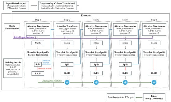 Unlike conventional neural networks, TabNet processes input data through multiple sequential decision steps, and each consists of two specialized branches: an attention branch and a decision branch []. The attention branch utilizes an Attentive Transformer to dynamically learn masks over the initial input features, and to determine feature importance and select the most informative variables for each step. These selected features are then passed to the decision branch, where the Feature Transformer extracts relevant representations, splits the outputs into two components: one contributes to the final predictions through the aggregated features stream, while the other feeds forward to subsequent decision steps. This structured, stepwise feature selection and transformation process allows TabNet to explicitly model complex interactions and nonlinearities among static and time-varying inputs. Moreover, TabNet’s iterative masking mechanism enhances interpretability by highlighting feature contributions at each decision step, which makes it particularly powerful for handling high-dimensional hybrid datasets common in building energy prediction and thermal resilience assessments. As demonstrated in Figure 4, the input layer of TabNet received a total of 23 features, consisting of six categorical building descriptors (Climate, Building, Wall, Roof, Floor, Window) and 17 continuous numerical climate and simulation variables (e.g., outdoor temperature, humidity, solar radiation, wind speed). The output layer was defined as a linear regression head with five neurons, each corresponding to one of the direct time-series targets: indoor temperature, relative humidity, humidity ratio, heating energy, and cooling energy. In addition, seven scenario-level resilience metrics were computed in a post-processing step by aggregating and analyzing the predicted time-series outputs using Scenario ID.