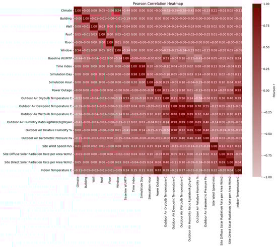The resulting dataset combines static and time-series features (inputs), and static and time-series targets (outputs) for AI model training. Static features include climate zone, building type, and envelope configuration, together with the baseline WUMTP value. Time-series features capture temporal and weather-related drivers such as simulation day and hour, power outage status, outdoor temperature, humidity, solar radiation, and wind speed. The prediction targets consist of both dynamic outputs (indoor temperature, relative humidity, humidity ratio, heating and cooling energy) and static resilience metrics. Table 2 summarizes all features and targets.