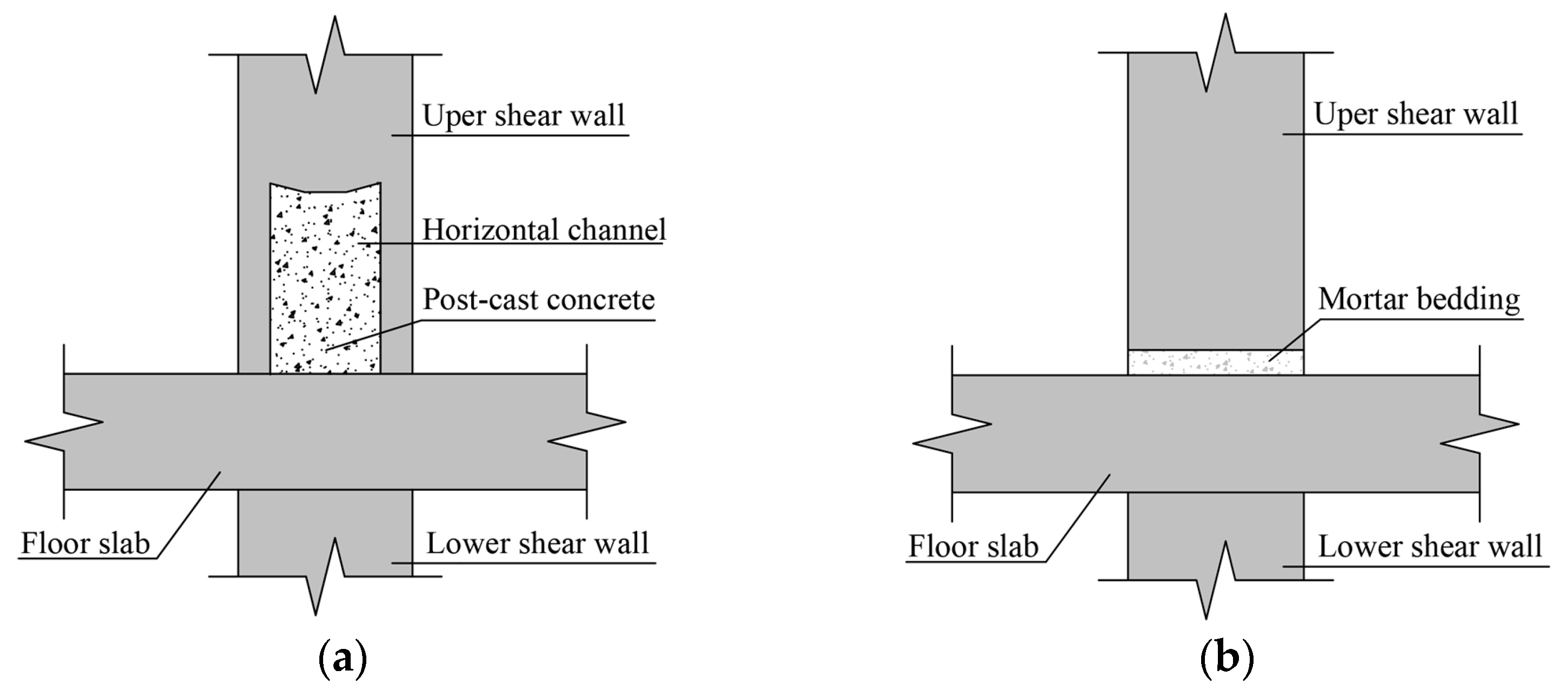 The joint formed during the vertical connection of precast units is referred to as the “horizontal joint”. In precast concrete shear walls, horizontal ducts are typically pre-reserved at the horizontal joint for concrete casting or a mortar bedding layer is provided to enhance the integrity of the connection [