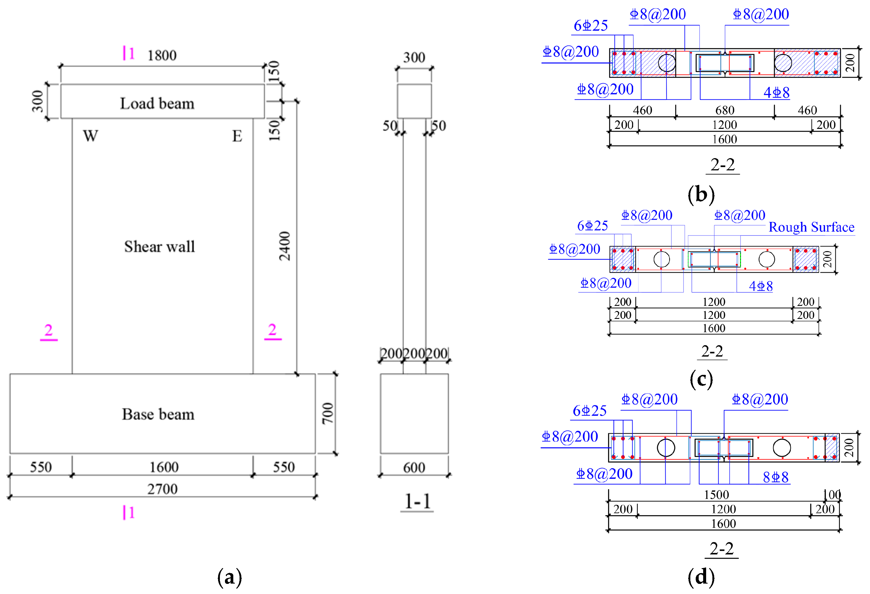 Figure 2b–d. The boundary members were reinforced with 6C25 longitudinal bars, corresponding to a reinforcement ratio of 7.36%. The stirrups were C8@200, with a volumetric stirrup ratio of 0.72%. Both the horizontal and longitudinal distributed reinforcements were C8@200. Additionally, longitudinal grooves were provided with connecting bars (C8@200) and longitudinal bars (2C8 on each side of the groove). Concrete was then poured to achieve the connection between the precast wall panels.