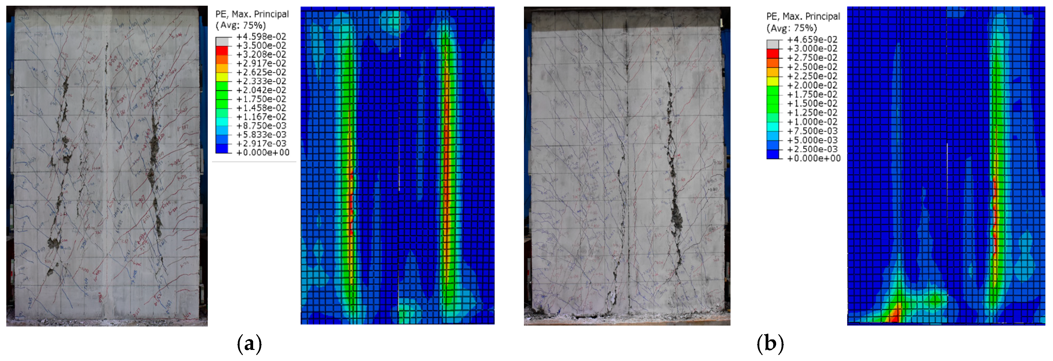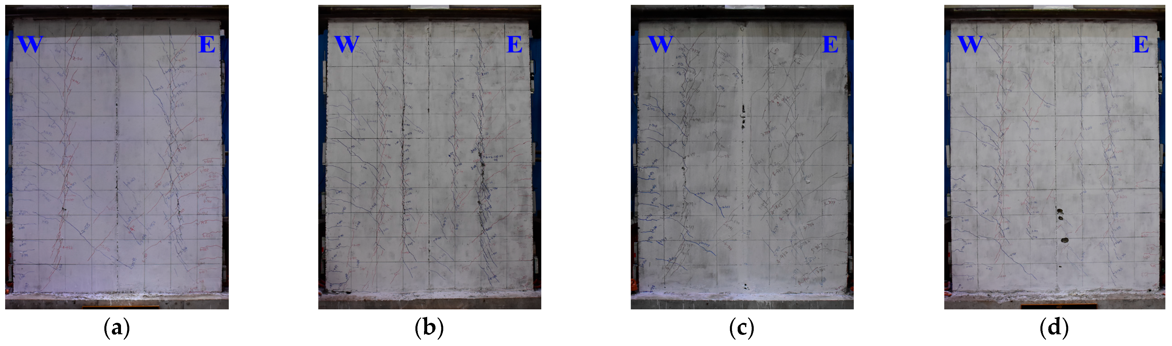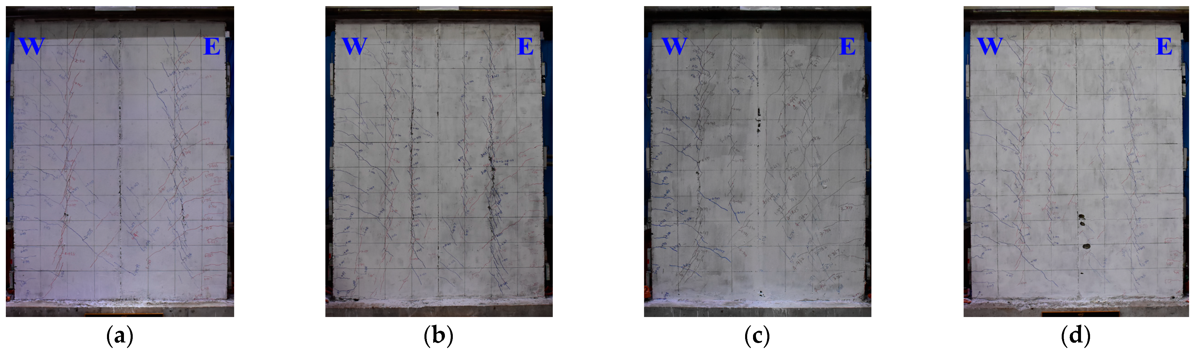 Figure 6a. At a controlled inter-story drift of 1/140, the macroscopic vertical cracks on the east and west sides intensified, forming distinct vertical cracks. This phenomenon prevented the development of overall diagonal cracks and avoided brittle failure of the wall as illustrated in