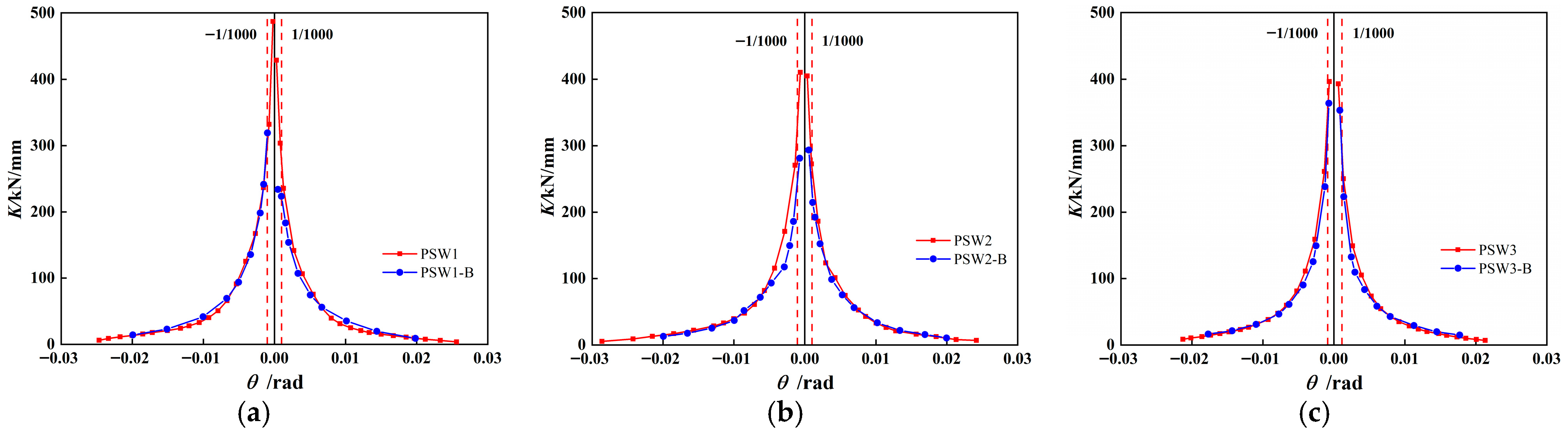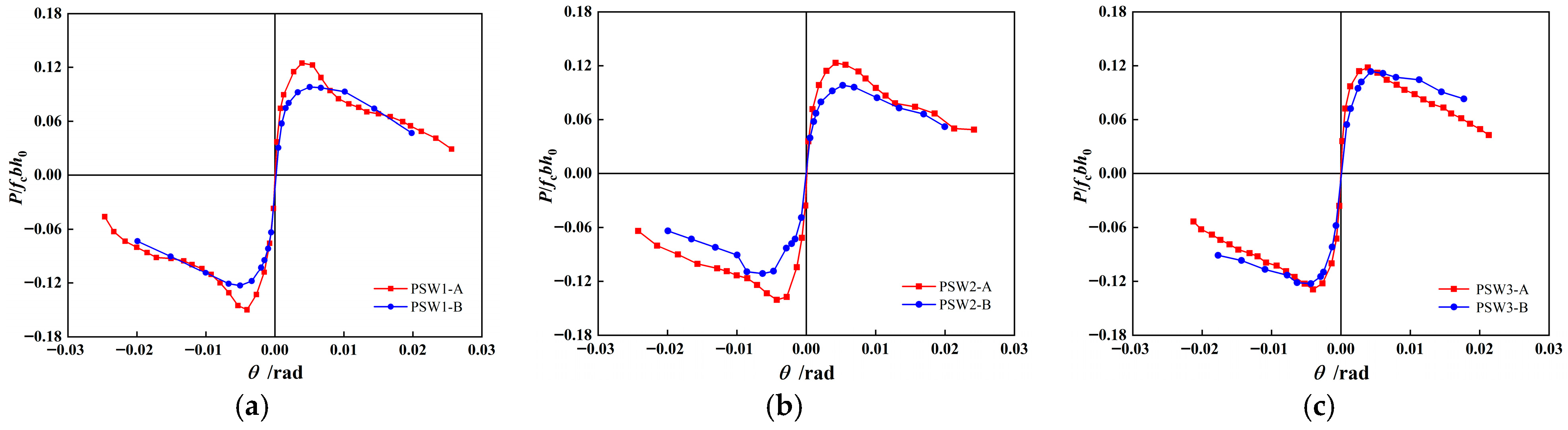 The quality defect in the horizontal joint of the central wall region resulted in an increased yield displacement for specimen PSW1-B. During displacement-controlled loading, the increment steps were larger, leading to a rapid increase in the hysteresis loop area and a reduction in the pinching effect of the hysteresis curve.