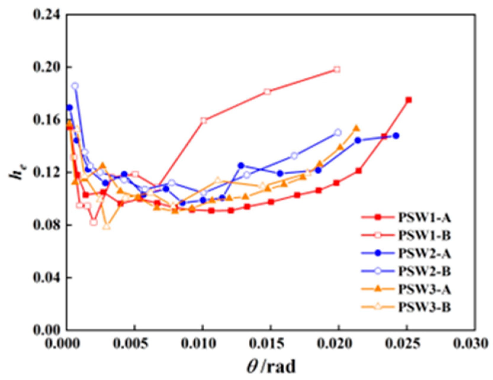 Before cracking, the specimens exhibited primarily elastic deformation, with small hysteresis loop areas and negligible residual deformation. As the displacement at the loading point increased, cracks in the wall developed and extended, leading to a gradual increase in the hysteresis loop area, stiffness degradation and improved energy dissipation capacity.