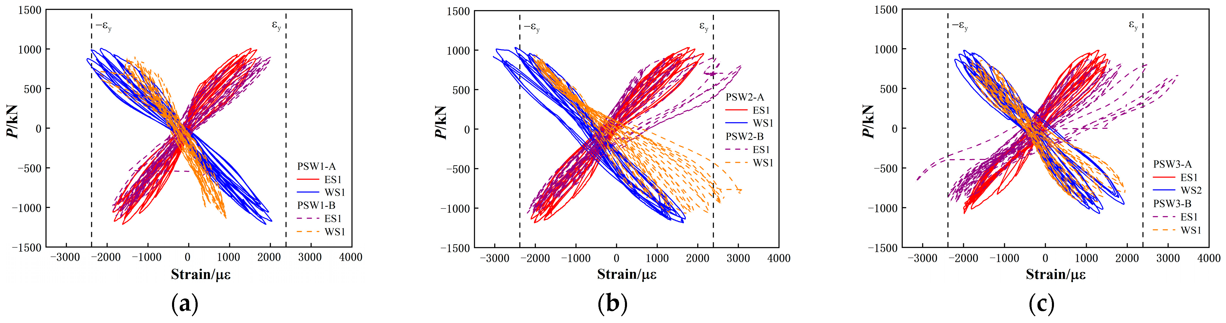 For specimen PSW1-A, when the controlled load reached 500 kN, multiple short diagonal cracks appeared at the positions corresponding to the vertical circular holes on both sides of the wall. At a controlled load of 660 kN, fine horizontal cracks formed at the intersections of the wall and the ground beam on both sides. When the controlled load reached 886 kN, horizontal cracks appeared at the boundary members at the wall ends and developed diagonally downward into diagonal cracks, marking the yielding of the wall with a yield displacement of 3.9 mm.