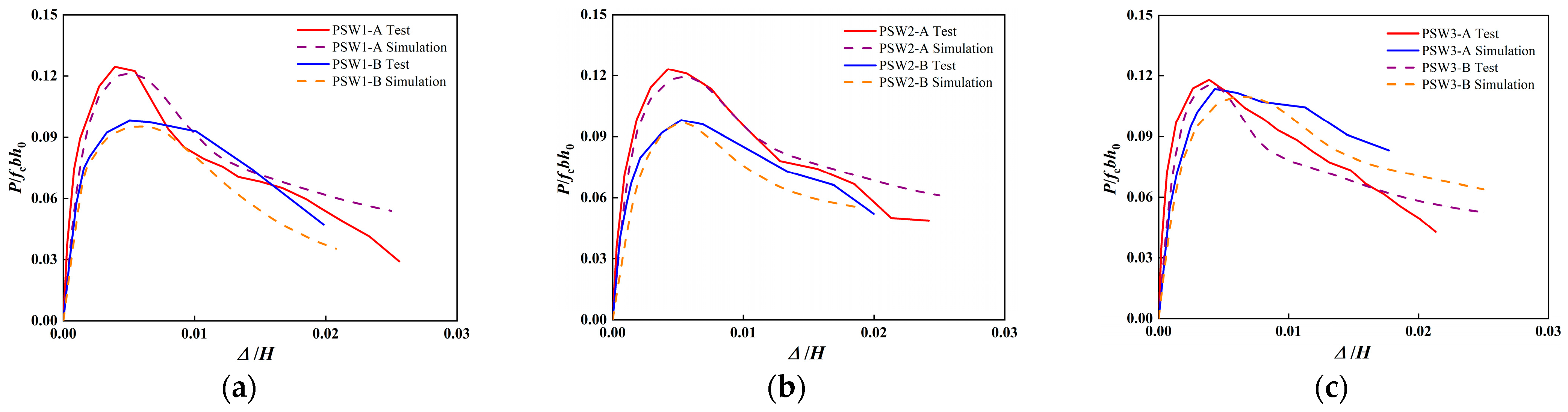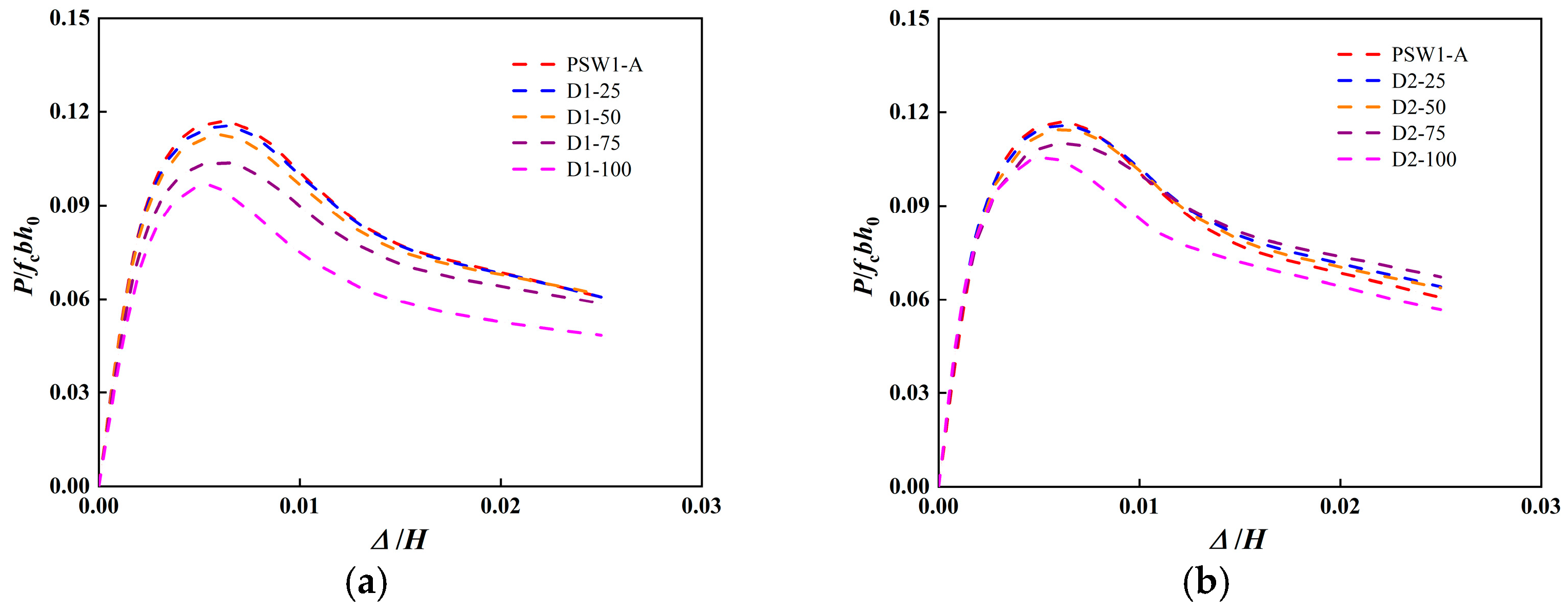 Figure 11 show the horizontal load–displacement hysteresis curves and skeleton curves for each specimen at the loading point, respectively. To account for the influence of concrete variability, the vertical axis is represented by the shear-compression ratio
