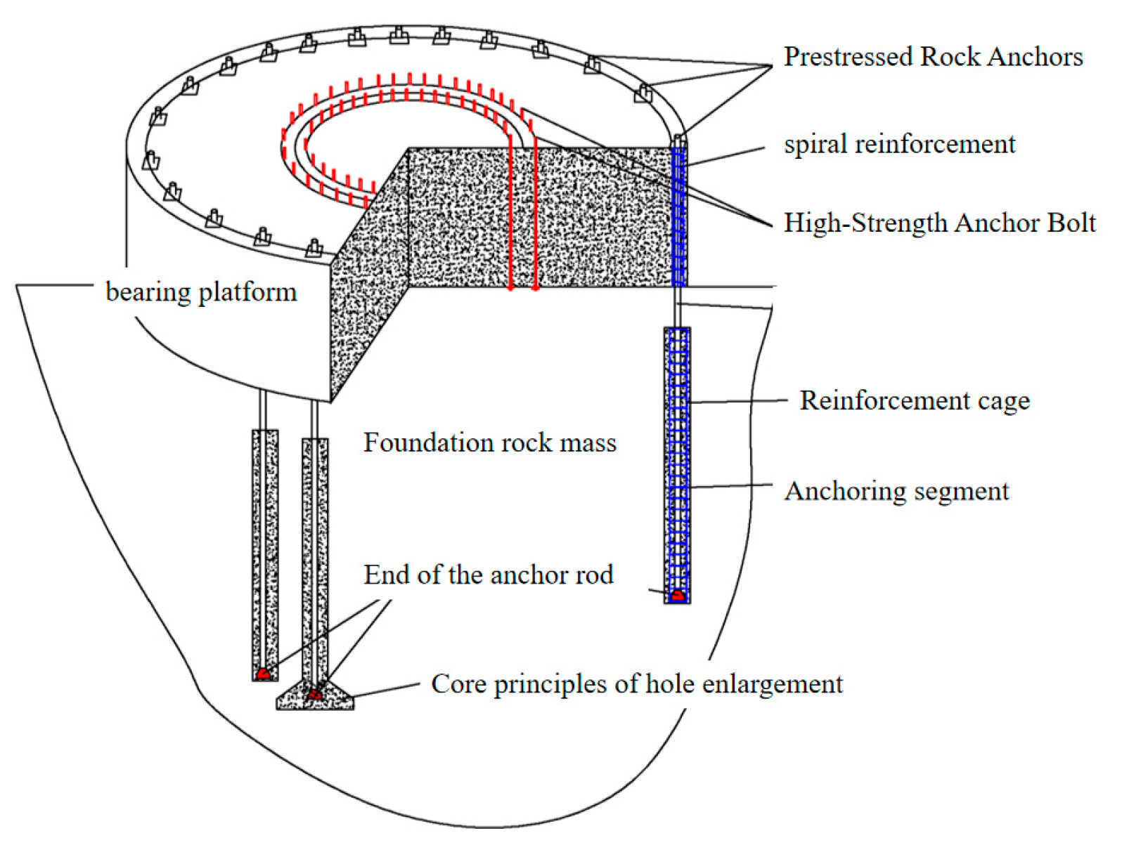 Prestressed rock anchors are widely utilized in various engineering projects, particularly in high-rise buildings, bridges, tunnels [1,2,3,4], and wind power foundations [5]. The rationality of their design directly influences the safety and economic viability of these structures. As the scale of engineering projects continues to expand, the design and analysis of anchor foundations face increasingly complex challenges. To ensure the long-term stability and safety of these structures, it is essential to conduct in-depth studies on the mechanical behavior of anchors. The schematic diagram of the prestressed rock anchor foundation for a certain wind turbine tower is shown in Figure 1.