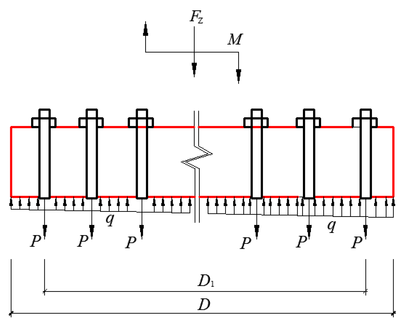 Assuming that both the concrete pedestal and the anchor materials satisfy the conditions of continuity, uniformity, and isotropy, we define the external diameter of the pedestal as D , the diameter of the anchor circle as D 1 , the number of anchors as n , and the diameter of each anchor as d . The prestress of a single anchor is denoted as P , while the vertical load acting on the upper part of the pedestal (primarily comprising the self-weight of the tower, nacelle, blades, pedestal, and ancillary facilities) is represented by F z . The static equivalent moment acting on the cross-section of the pedestal is denoted as M . Considering the interaction between the foundation and the pedestal, the distributed load system is represented as q . We isolate the pedestal and anchor components as the objects of study and establish a simplified model for the elastic analysis of the prestressed rock anchor foundation, as shown in Figure 2.