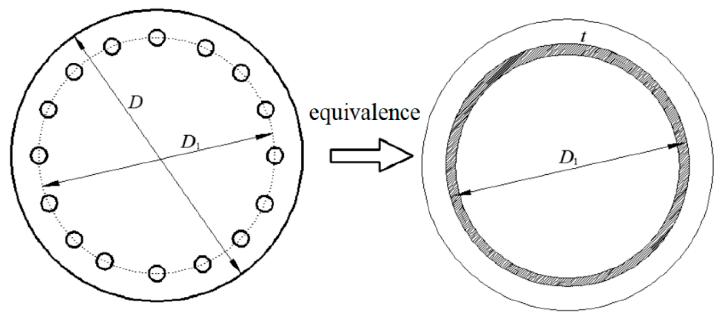 where ρ is the radius of curvature of the composite cross-section. The integral region A 2 in Equation (3) refers to the area of the anchor circle. To simplify calculations, we can statically equivalate the anchor circle to a steel ring, as illustrated in Figure 3. The average diameter of the equivalent steel ring is taken as D 1 , and its thickness is denoted as t, leading to the relations