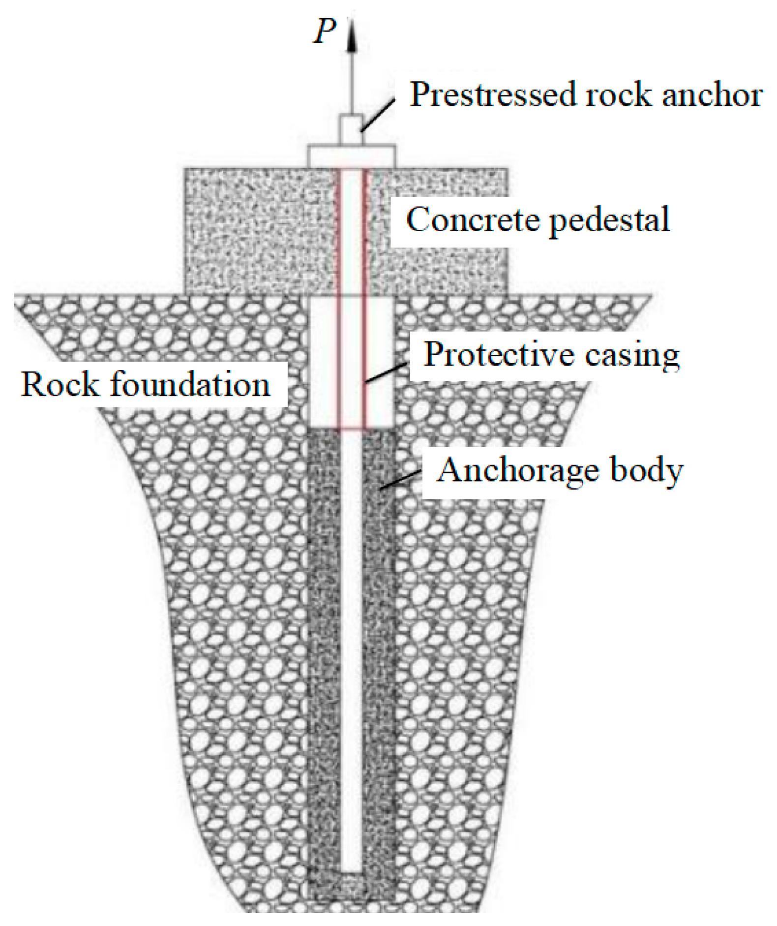 Figure 4 illustrates the configuration of a single prestressed rock anchor. The load transfer mechanism operates as follows: the wind turbine tower transmits loads to the concrete pedestal through high-strength anchors. The concrete pedestal, in turn, transfers these loads to the anchorage body, which subsequently passes the loads to the rock foundation. This load transfer process is straightforward and clearly defined.