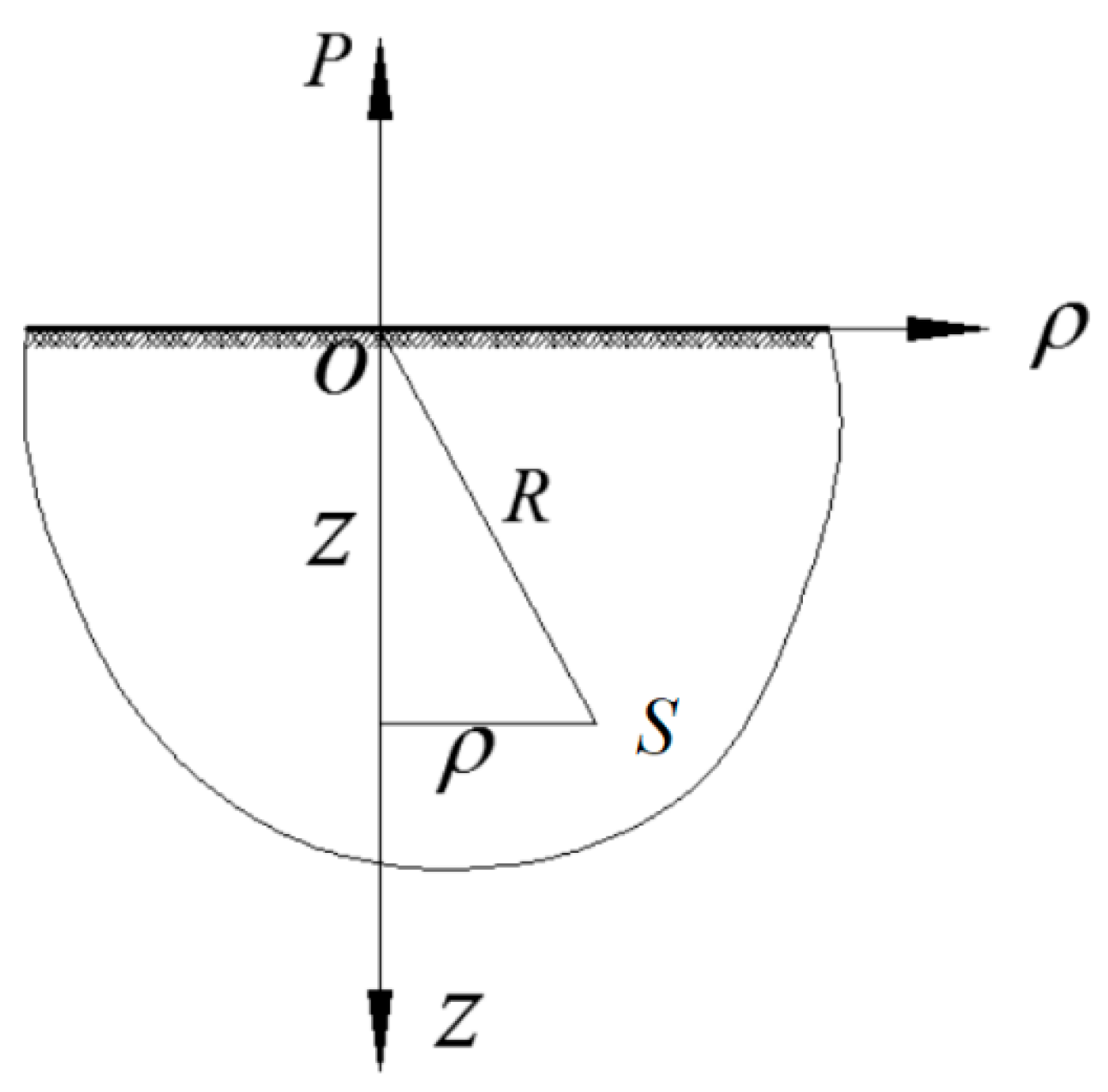 where R = ρ 2 + z 2 . Equation (15) provides the stress field for a half-space subjected to an uplift force at the boundary, which serves as a theoretical foundation for studying the stress field of prestressed rock anchors. This analysis will guide the determination of relevant parameters for full-scale testing of prestressed rock anchors.