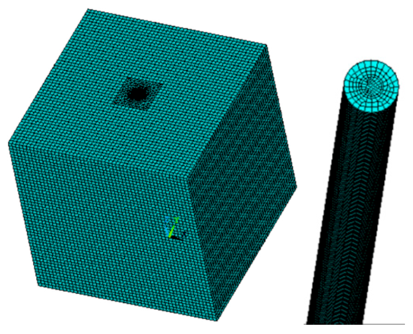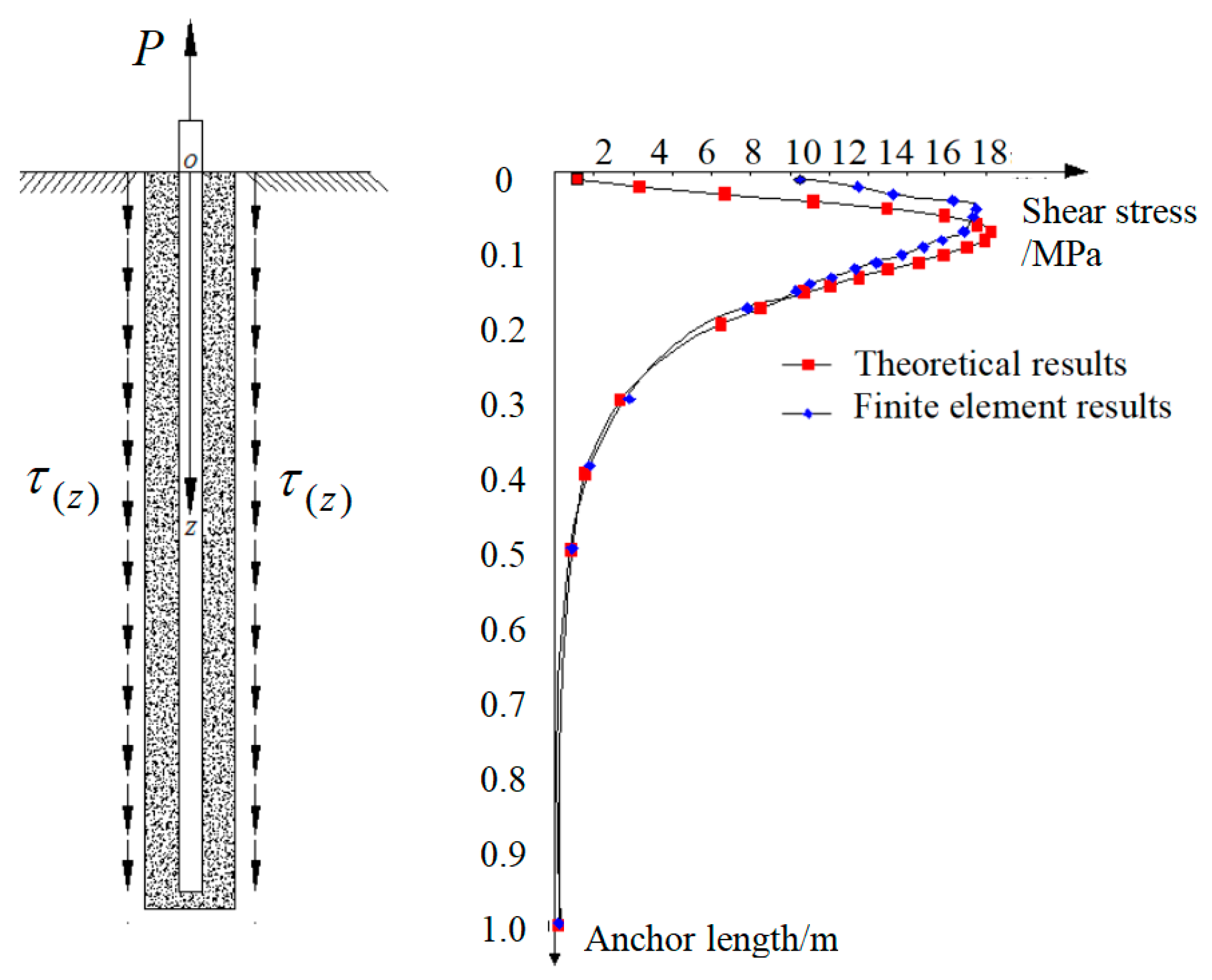 To further validate the reliability of the theoretical results, we employed the finite element software ANSYS 2024 R2 to establish a finite element model of the aforementioned anchor, as shown in Figure 7, for numerical verification. We extracted the shear stress at the anchorage-rock interface per unit depth and compared it with the theoretical results, as illustrated in Figure 8: