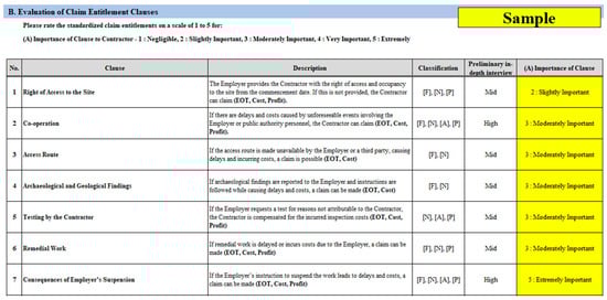 After completing the preliminary in-depth interviews, survey questions were developed based on the reclassified data. To provide insights for the survey, Figure 2 includes the clauses and descriptions. The survey was distributed to 40 experts with extensive experience in international construction and contract management. The importance of each clause to the contractor was rated on a five-point Likert scale: 1 = Negligible; 2 = Slightly Important; 3 = Moderately Important; 4 = Very Important; 5 = Extremely Important. These scores were used to identify highly important clauses for developing the checklist model.