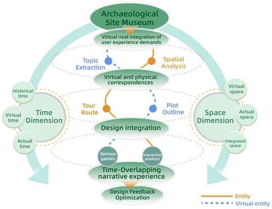 However, site spaces carry layered histories and collective memories; their narratives are not merely the reproduction of physical structures but rather the composite expression of temporality, events, and emotions []. Traditional applications of the triadic theory mainly focus on the social construction of space [], where temporal information is often implicit, making it difficult to fully address the temporal layering and emotional transmission intrinsic to archaeological sites. In the experiential process of site museums, historical context, virtual content, and real-world experience must be temporally aligned to achieve holistic virtual-physical integration. Accordingly, this study extends the traditional spatial narrative framework by incorporating three temporal dimensions—historical time, virtual time, and real time—corresponding to physical space, virtual space, and hybrid space, as summarized in Table 1. It further introduces the concept of spatiotemporal overlapping, referring to the interweaving of multiple temporal-spatial threads within the museum environment. Through the collaborative construction of physical and virtual elements, this approach enhances the sense of immersion and establishes a continuous, emotionally resonant experience that bridges virtual narratives and physical spaces.