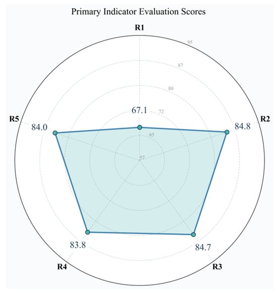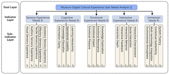 To ensure the scientific rigor of weight allocation, an evaluation panel was formed consisting of 4 museum spatial design experts, 6 interaction design graduate students, and 11 visitors. A fuzzy complementary judgment matrix was established using the 0.1–0.9 scale method (Table 3) and consistency testing was conducted. Based on the museum user experience needs analysis system Q, an evaluation framework is constructed that includes five primary indicator categories: sensory experience needs R1, cognitive experience needs R2, emotional experience needs R3, interactive experience needs R4, and immersion needs R5. Analysis using SPSSAU 25.0 (Beijing Qingsi Technology Co., Ltd., Beijing, China) shows that learning interactivity, visual sensory experience, and emotional resonance ranked as the top three weights (Table 4).