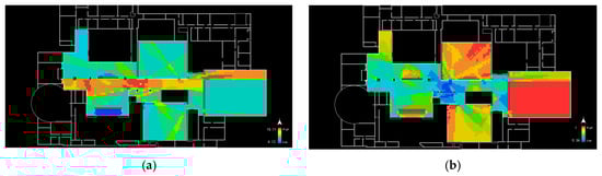 Results show that the central axis area of the museum has significant integration (Figure 4a), possessing advantages for guiding linear narrative and suitable as the main axis for linear narrative, achieving comprehensive learning interactivity throughout. The visual clustering coefficients inside exhibition halls are prominent (Figure 4b), with relatively enclosed spaces suitable for creating immersive atmospheres and emotional resonance fields, achieving emotional resonance. In response to users’ attention to visual sensory experience, dynamic visual media and color enhancement devices are embedded in nodes to create visual impact fields with rhythmic undulations. The overall spatial layout follows four narrative rhythm stages of beginning, development, climax, and ending. Through plot supplementation, eight suitable areas are finally determined to support layered transformation of user experience needs and rhythmic configuration of experience pathways in structural organization and functional distribution.