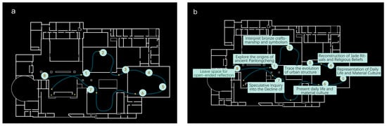 The overall spatial layout follows the classic four-stage narrative rhythm: introduction, development, climax, and conclusion. To enrich the narrative progression, an additional plot was incorporated into each stage, resulting in a total of eight designated zones. Based on isovist (visibility) analysis, the key loci were connected to form a visitor circulation route (Figure 5a). Subsequently, the functional roles of each locus within the physical exhibition layout were analyzed (Figure 5b), providing structural support for the correspondence between virtual and physical narrative plots.