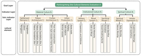 Space is not a physical container but a medium carrying cultural information []. This study integrates the Three Levels of Culture Theory to systematically analyze the cultural connotations of the Panlongcheng archaeological site []. From the three dimensions of material culture, institutional culture, and spiritual culture, nine core elements were extracted (Table 6), forming the evaluation framework of cultural narrative elements for the Panlongcheng site (Figure 6).