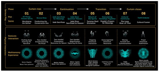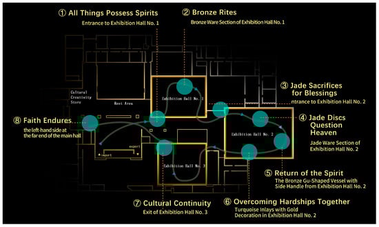 To strengthen the connection between physical space and virtual experience, the functional roles of the spatial loci identified in the physical space analysis were combined with the extracted spiritual and belief-related narrative themes, and plots were assigned according to the exhibition context of each node. Specifically: Locus 1: Preparation for ritual. Locus 2: Bronze sacrificial ritual. Locus 3: Evolution of royal authority symbolism. Locus 4: Jade ritual. Locus 5: Tortoise-shell divination. Locus 6: Significance of royal power. Locus 7: Speculation on the conclusion of Panlongcheng. Locus 8: Collective development of civilization.