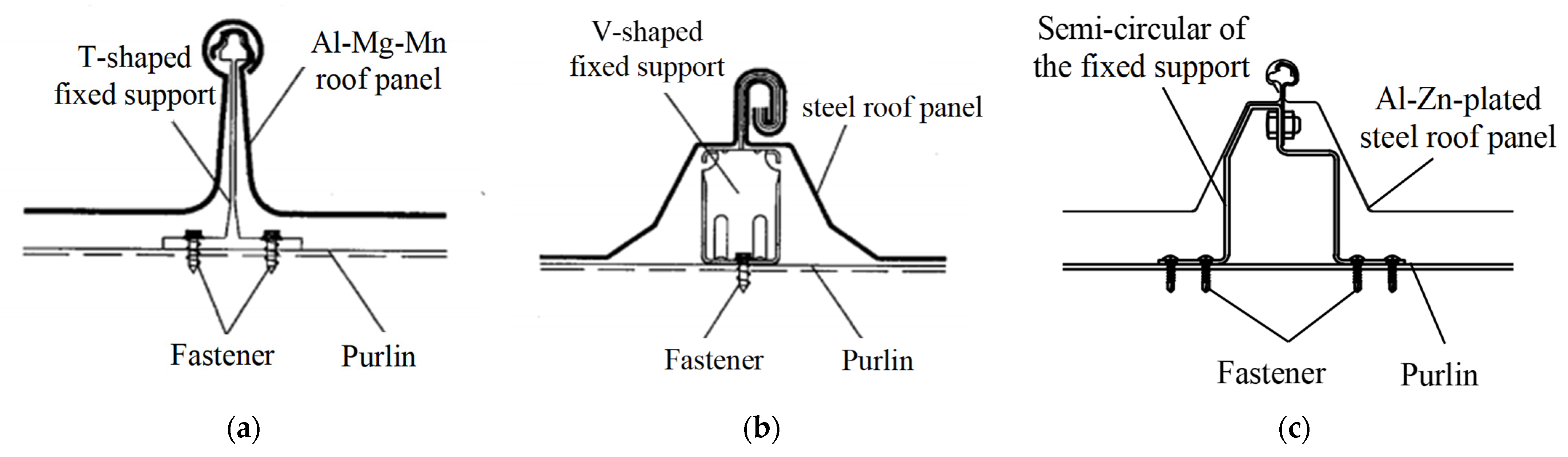 Construction details at connection points between commonly used types of standing seam metal roof systems. (a) Standing seam Al-Mg-Mn roof system. (b) Standing seam steel roof system. (c) Standing seam Al-Zn-plated steel roof system.