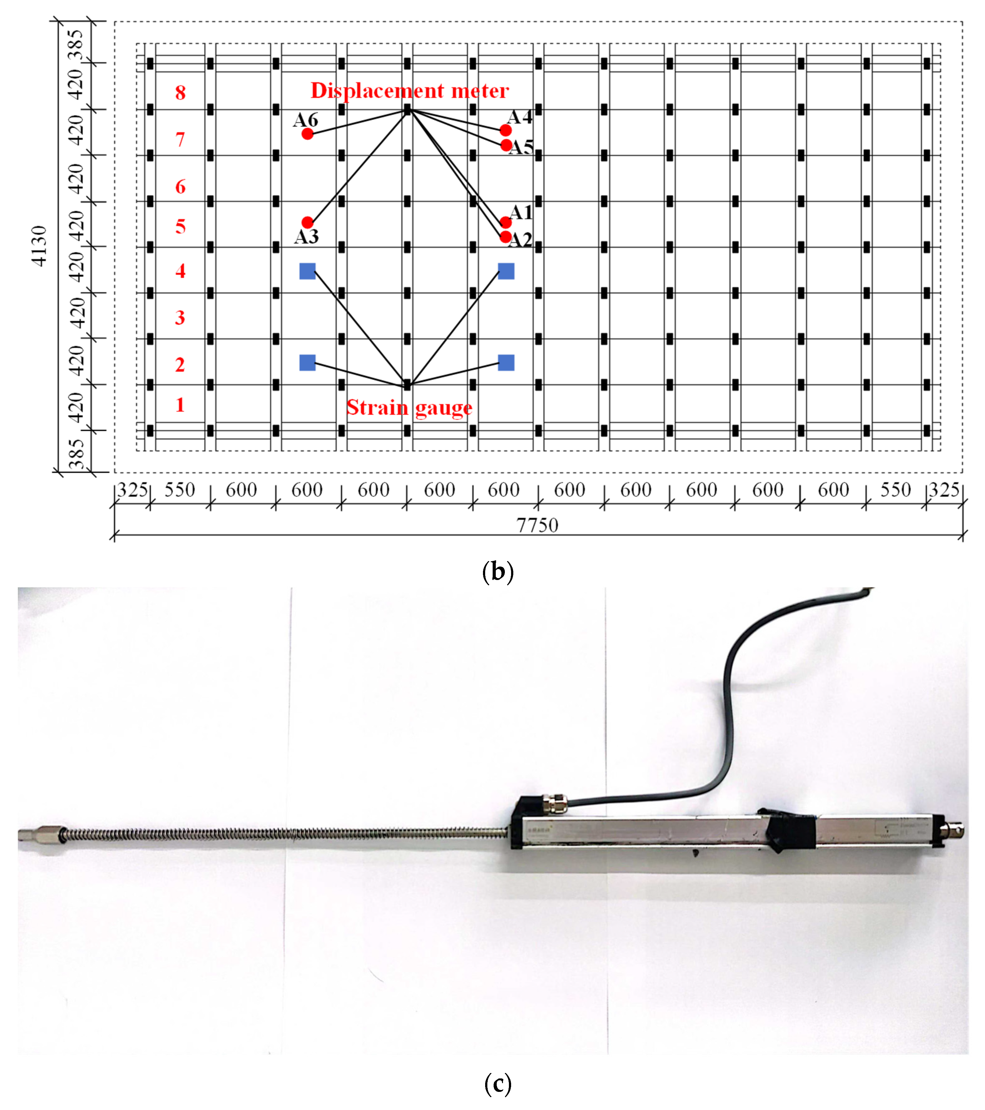 Wind uplift test loading device and measurement point layout. (a) Loading device. (b) Displacement and strain measurement point layout diagram (unit: mm). (c) Spring-return linear displacement gauge.