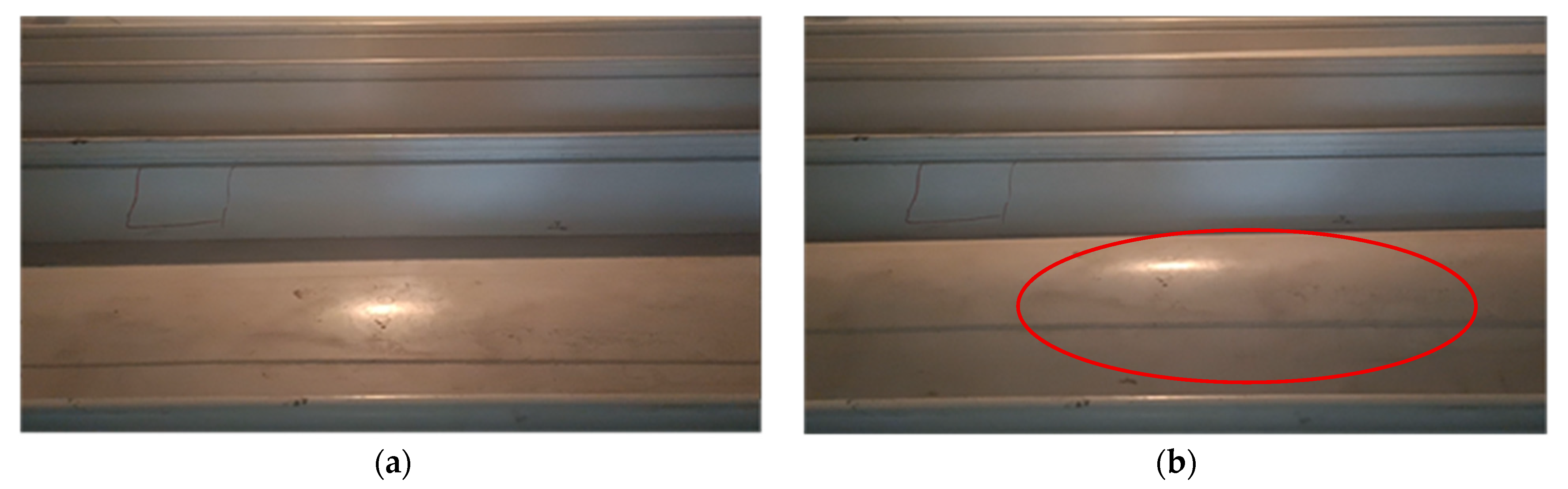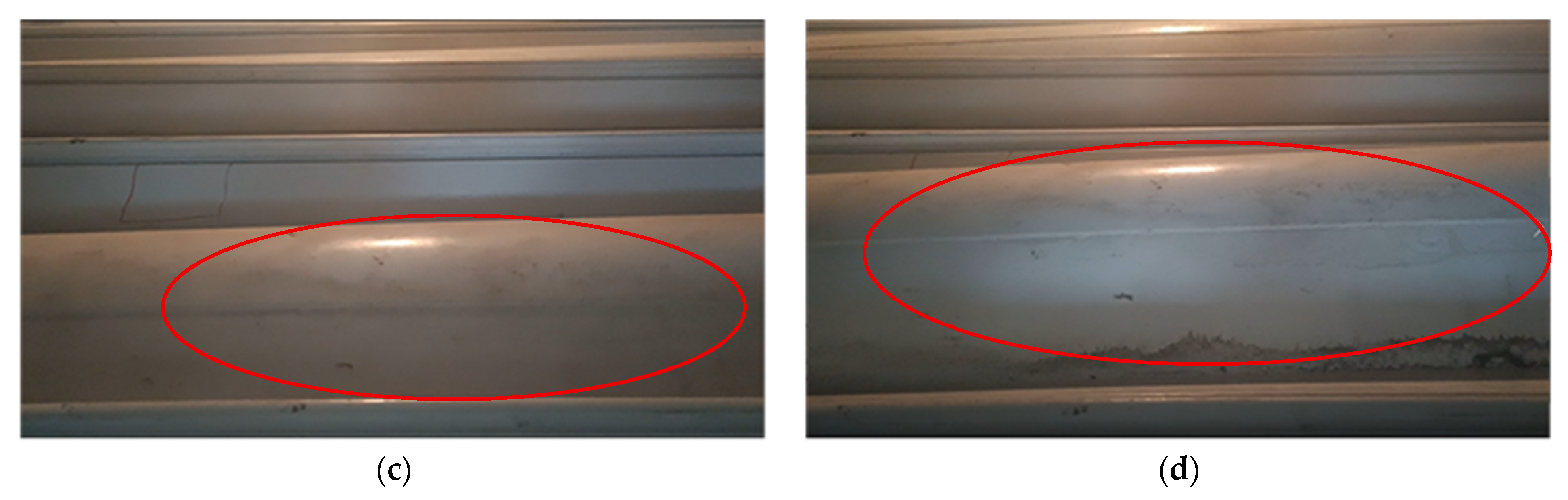 Static loading deformation process of Al-Zn-plated steel roof panels (deformed areas indicated by red ovals). (a) The roof is initially in a state of no deformation. (b) The roof is slightly bulging and deformed. (c) The roof is severely bulging and significantly deformed. (d) The roof is in a state of extreme deformation.