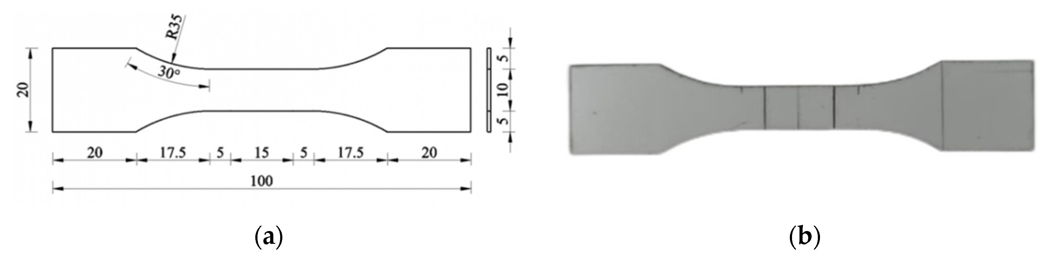 Specimen overview. (a) Specimen dimensions (unit: mm). (b) Actual samples.