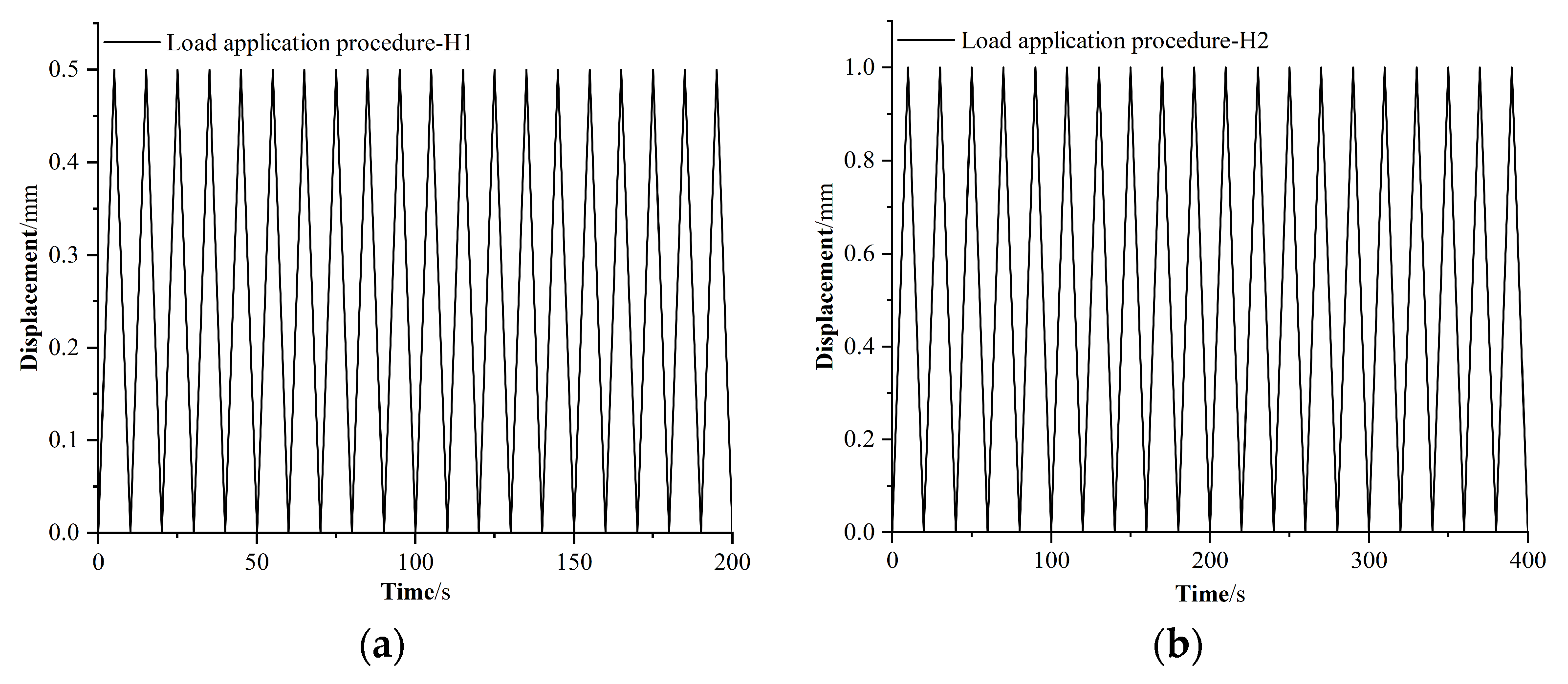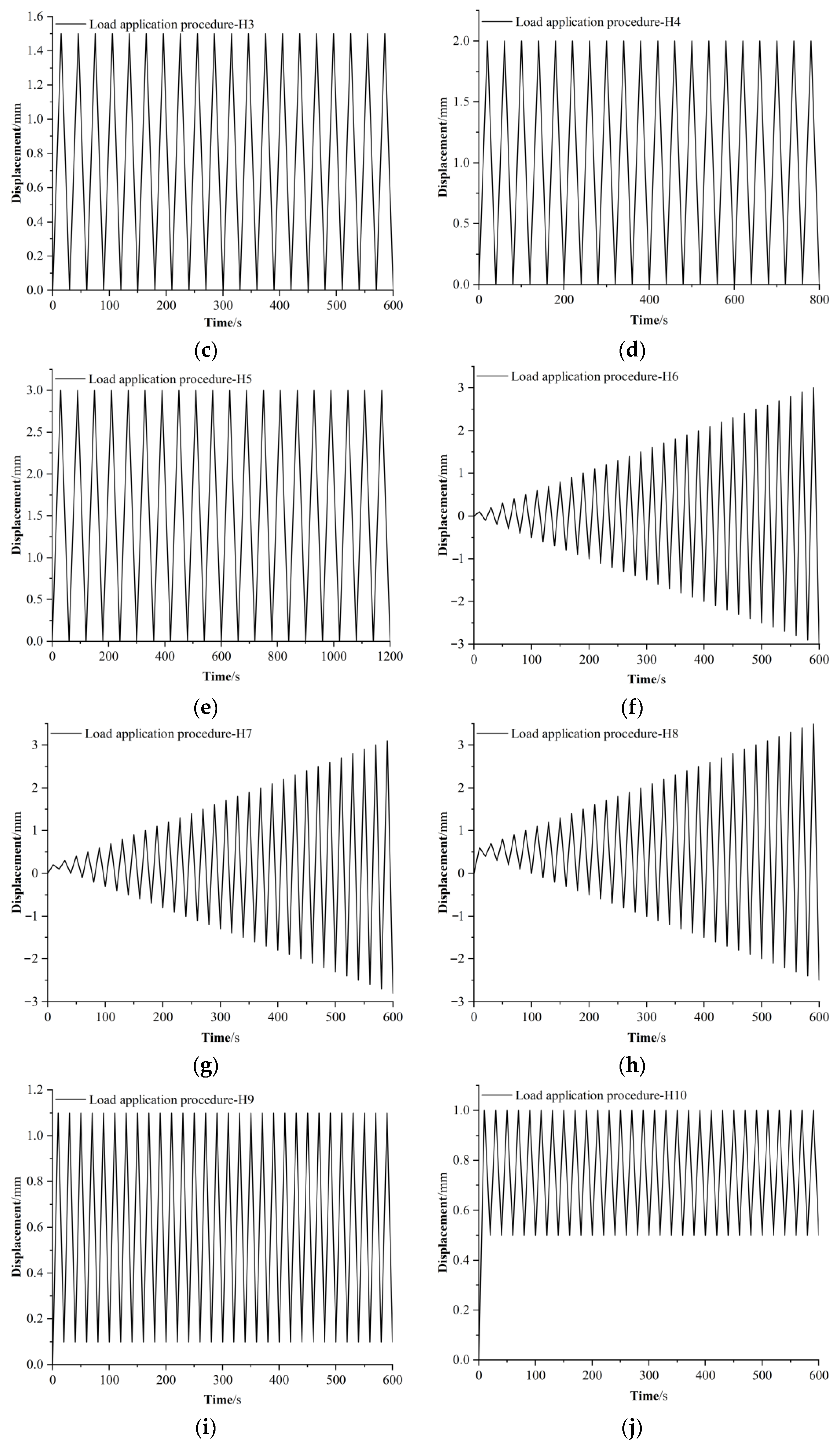 Loading sequence for each operating condition. (a) Displacement amplitude is 0.5 mm. (b) Displacement amplitude is 1.0 mm. (c) Displacement amplitude is 1.5 mm. (d) Displacement amplitude is 2.0 mm. (e) Displacement amplitude is 3.0 mm. (f) Initial displacement is 0 mm, increment is 0.1 mm. (g) Initial displacement is 0.1 mm, increment is 0.1 mm. (h) Initial displacement is 0.5 mm, increment is 0.1 mm. (i) Initial displacement is 0.1 mm, increment is 1.1 mm. (j) Initial displacement is 0.5 mm, increment is 1.0 mm.