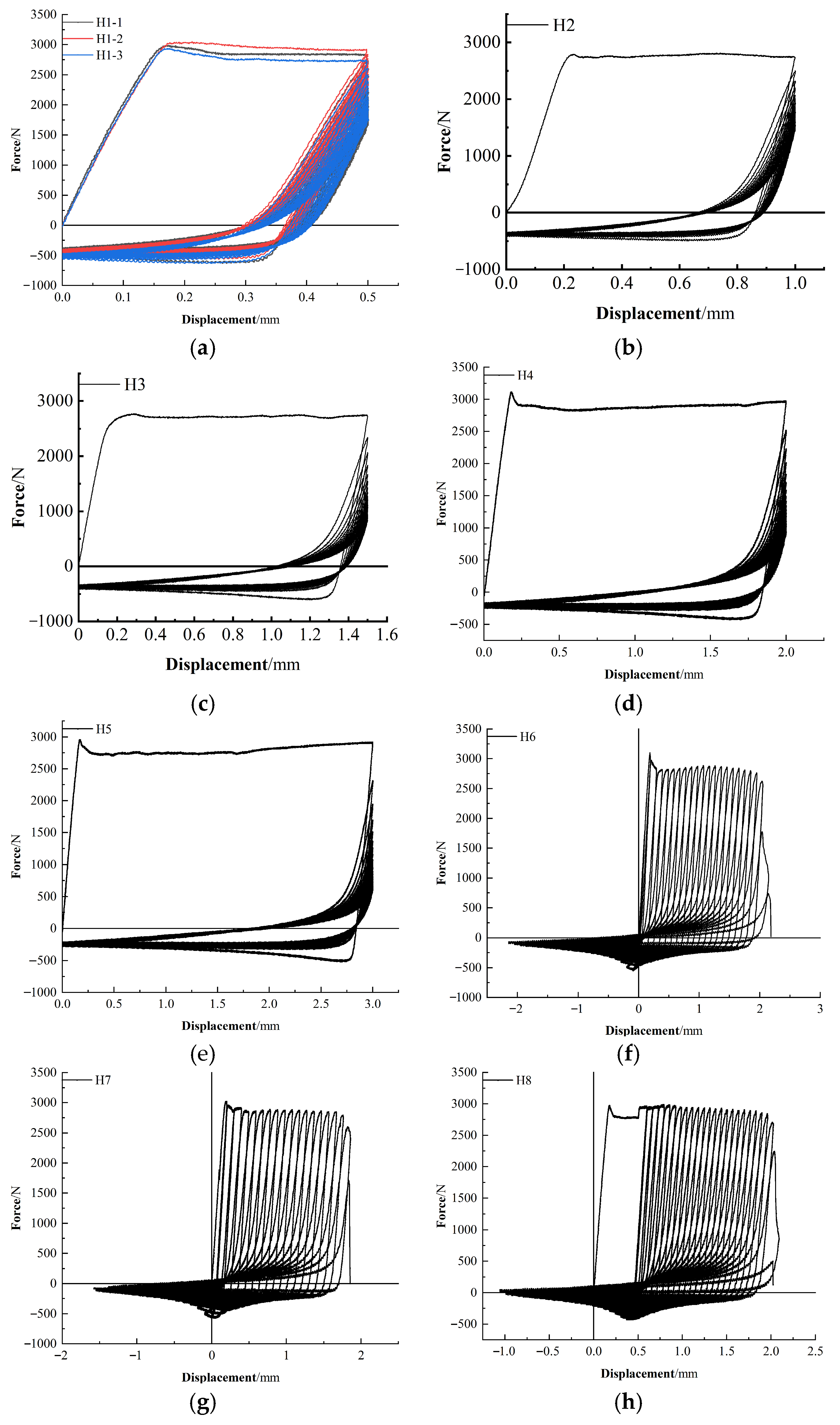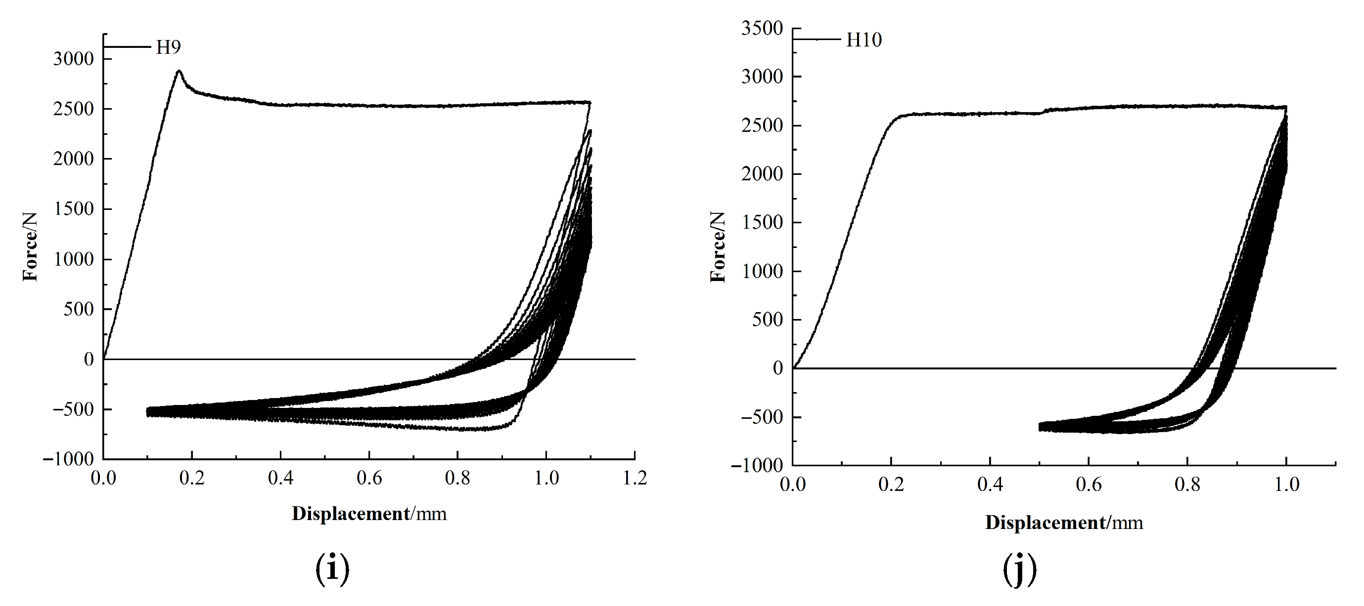 Test curves for each cyclic load application procedure. (a) H1, (b) H2, (c) H3, (d) H4, (e) H5, (f) H6, (g) H7, (h) H8, (i) H9, (j) H10.