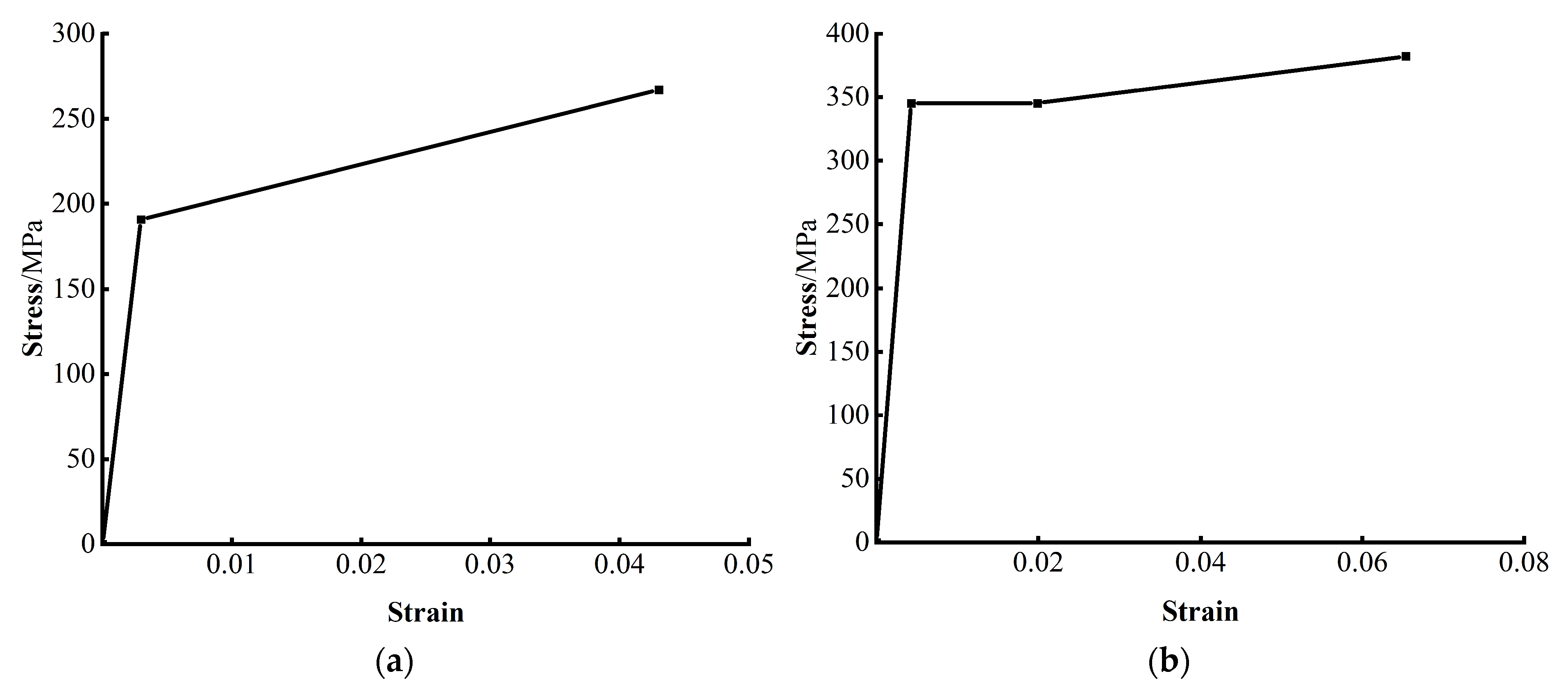 Constitutive relationship of roof panel materials. (a) Al-Mg-Mn roof material. (b) Al-Zn-plated steel roof material.