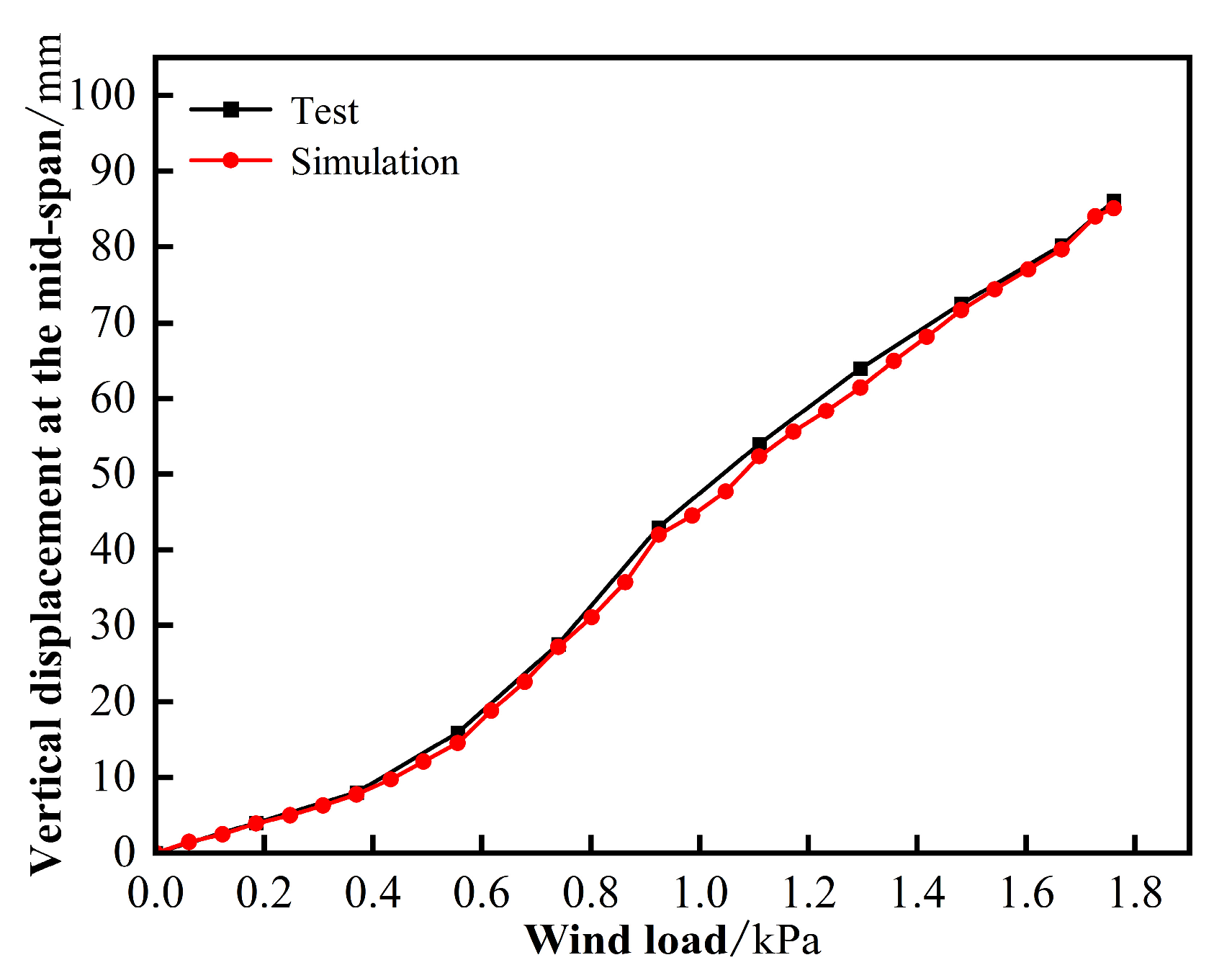 Comparison of simulation results of Al-Mg-Mn roof model with wind uplift test results.