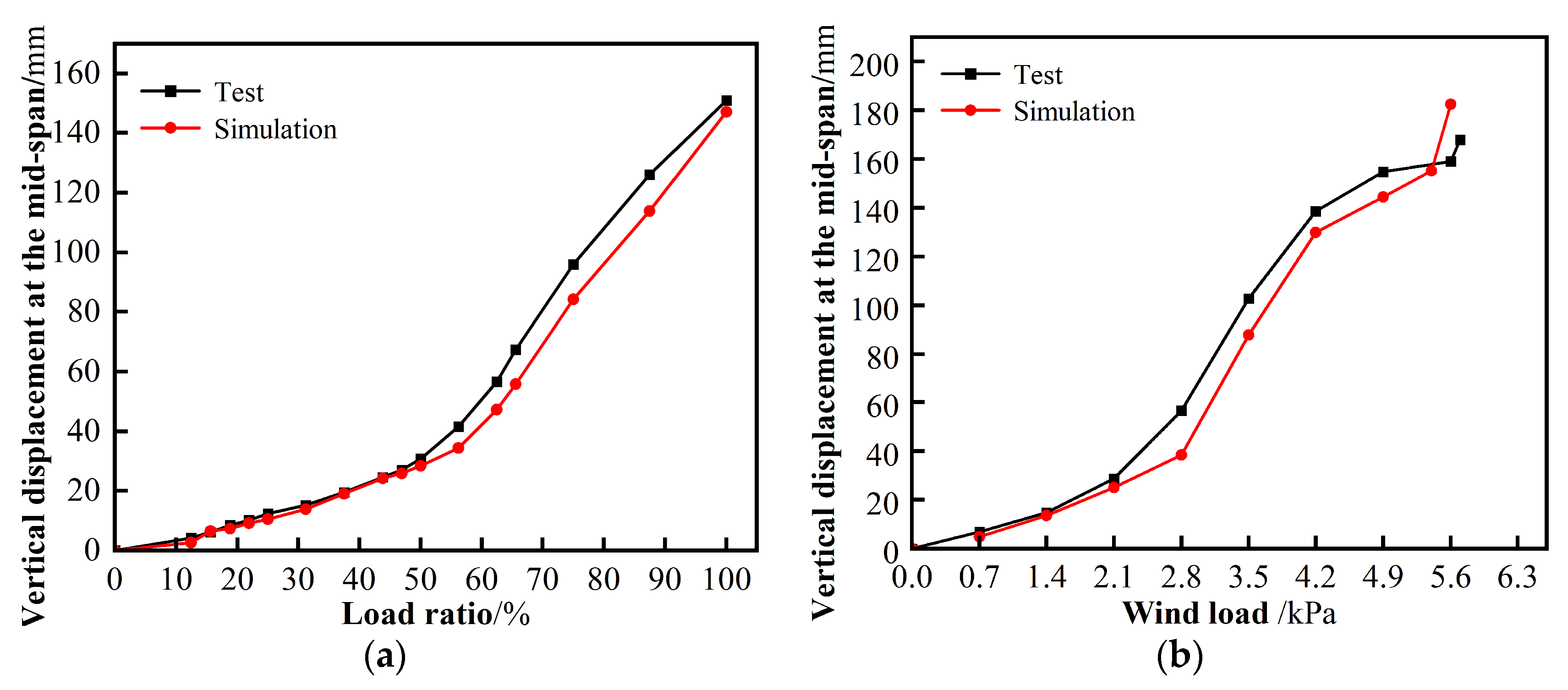 Comparison of simulation results of Al-Zn-plated steel roof model with wind uplift test results. (a) Comparison between cyclic loading test and simulation. (b) Comparison between ultimate loading test and simulation.