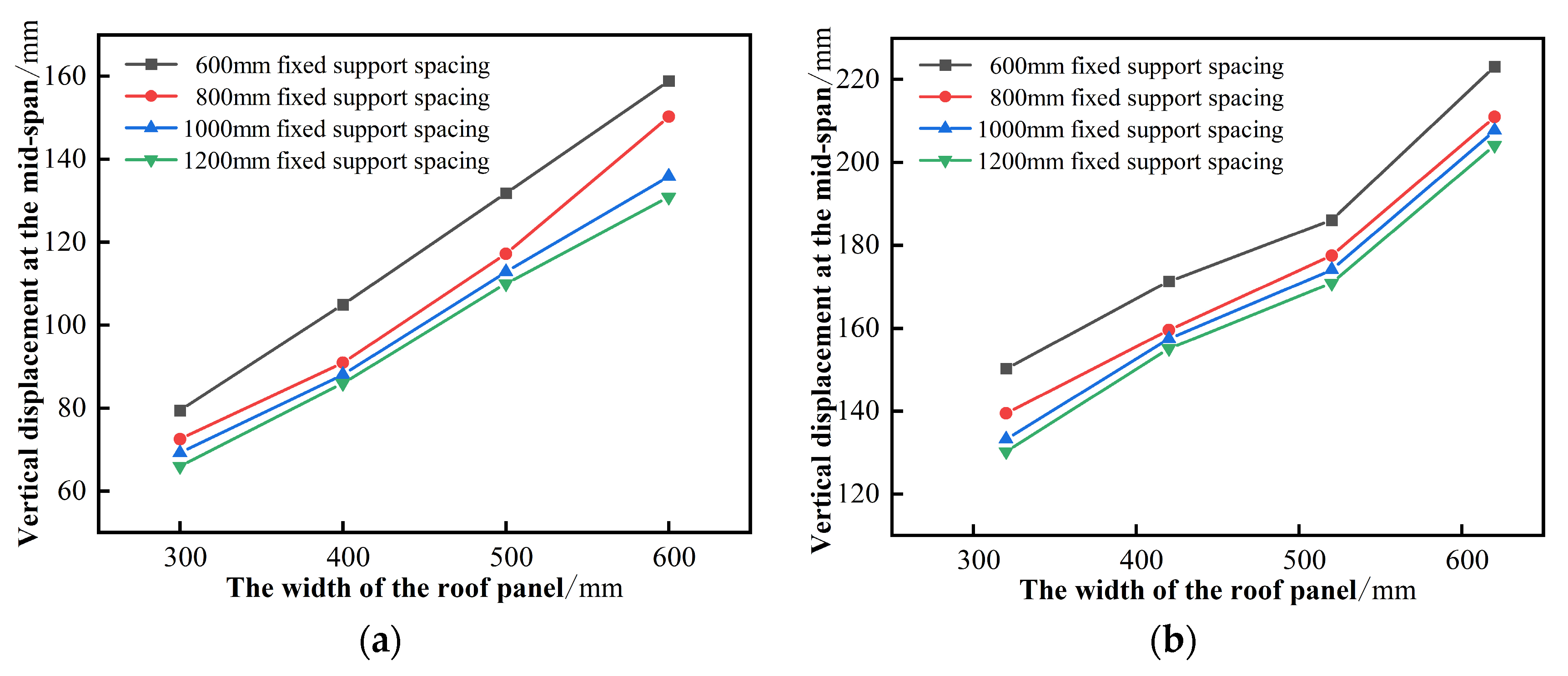 Load-to-midspan vertical displacement curve of roof systems under different operating scenarios. (a) Standing seam Al-Mg-Mn roof system. (b) Standing seam Al-Zn-plated steel roof system.