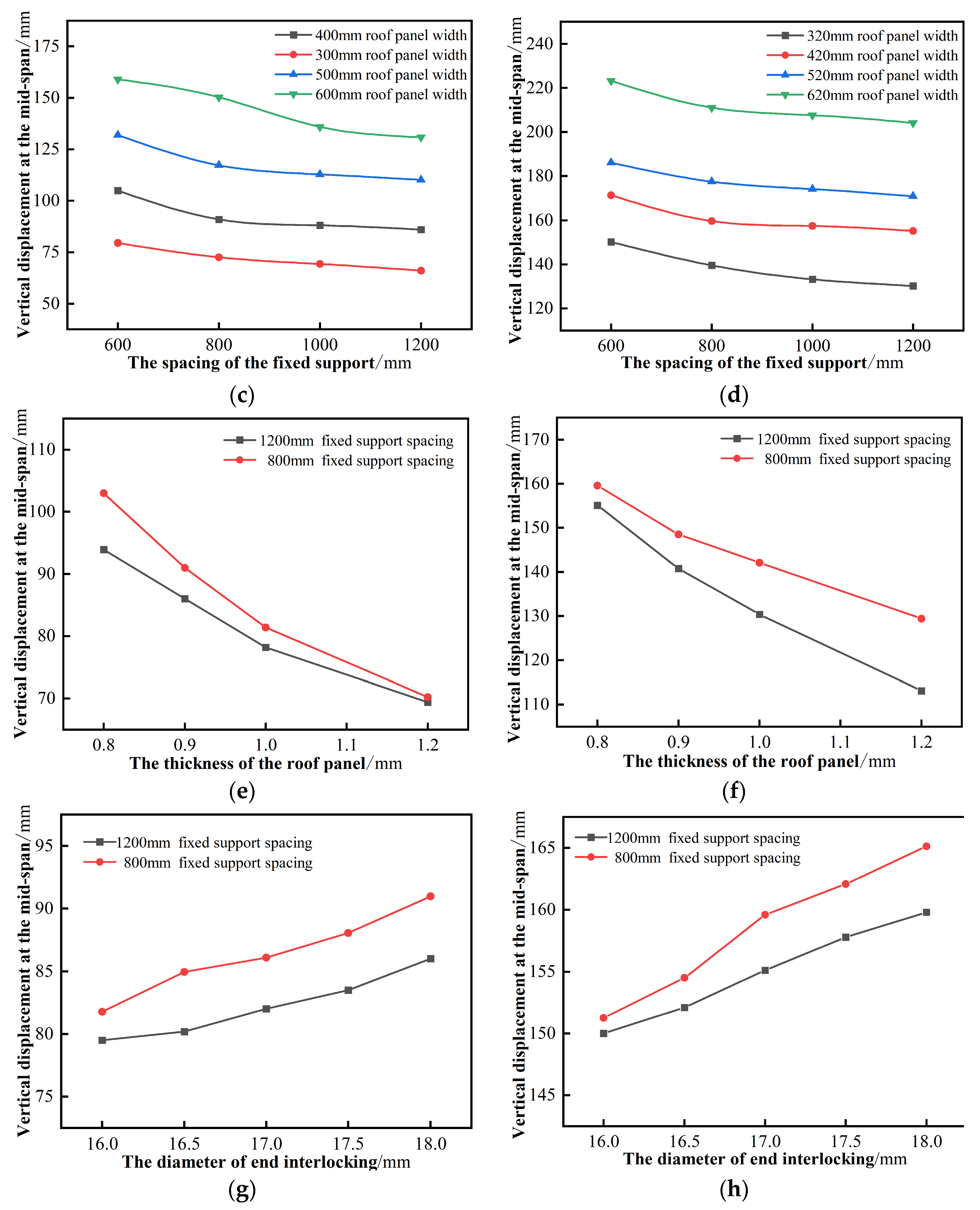 The effect of different structural parameters on the vertical displacement at the mid-span of two types of roof systems. (a) The effect of the width of Al–Mg–Mn roof panels. (b) The effect of the width of Al-Zn-plated steel roof panels. (c) The effect of the spacing between Al–Mg–Mn roof fixed supports. (d) The effect of the spacing between Al-Zn-plated steel roof fixed supports. (e) The effect of Al–Mg–Mn roof panel thickness. (f) The effect of Al-Zn-plated steel roof panel thickness. (g) The effect of the diameter of the Al–Mg–Mn roof end interlocking. (h) The effect of the diameter of the Al-Zn-plated steel roof end interlocking.