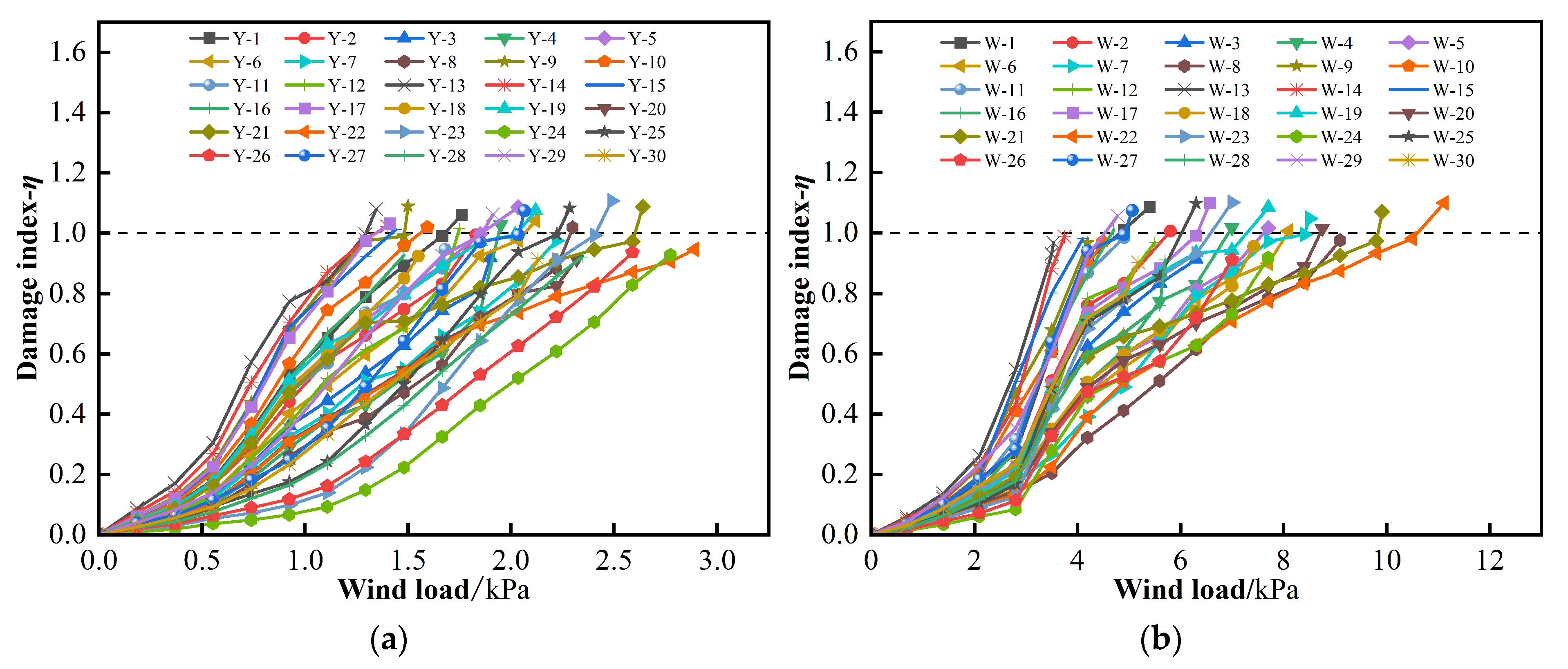 Load–damage index curve of roof systems under different operating scenarios. (a) Standing seam Al-Mg-Mn roof system. (b) Standing seam Al-Zn-plated steel roof system.