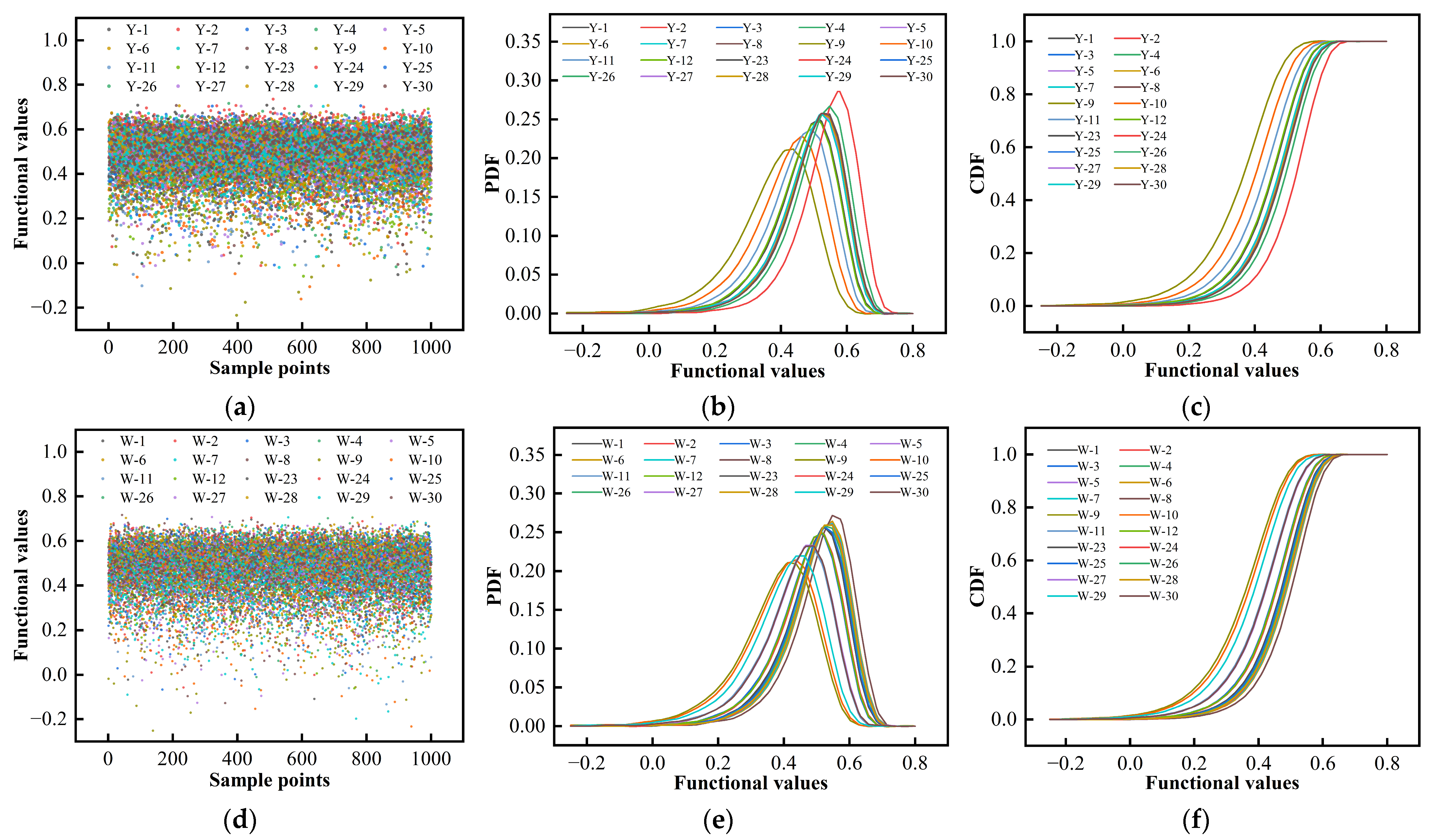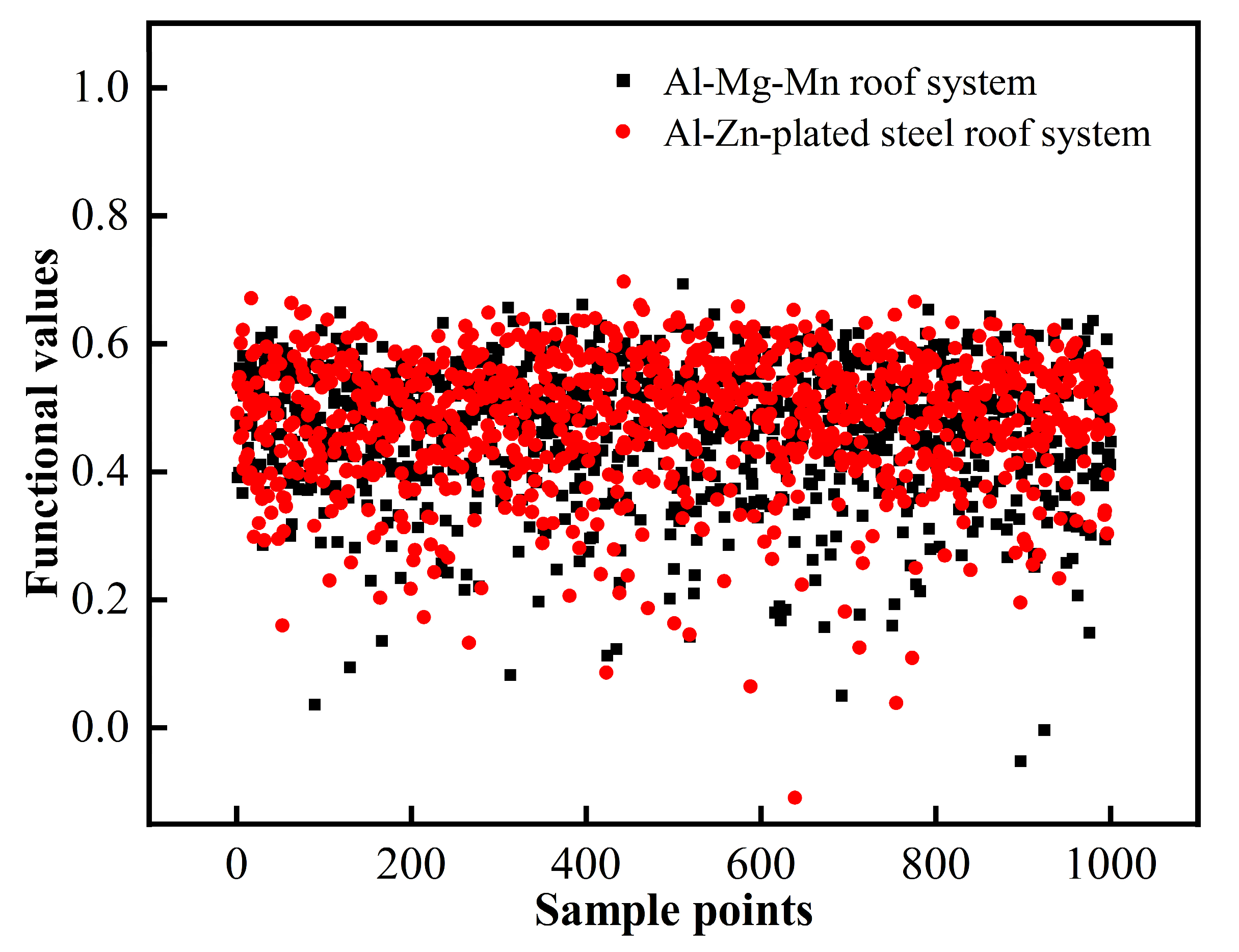Results of the limit state function of the roof systems under different structural parameters. (a) Sample points and functional values of Al–Mg–Mn roof system. (b) Probability density functions of Al–Mg–Mn roof system. (c) Cumulative distribution functions of Al–Mg–Mn roof system. (d) Sample points and functional values of Al-Zn-plated steel roof system. (e) Probability density functions of Al-Zn-plated steel roof system. (f) Cumulative distribution functions of Al-Zn-plated steel roof system.